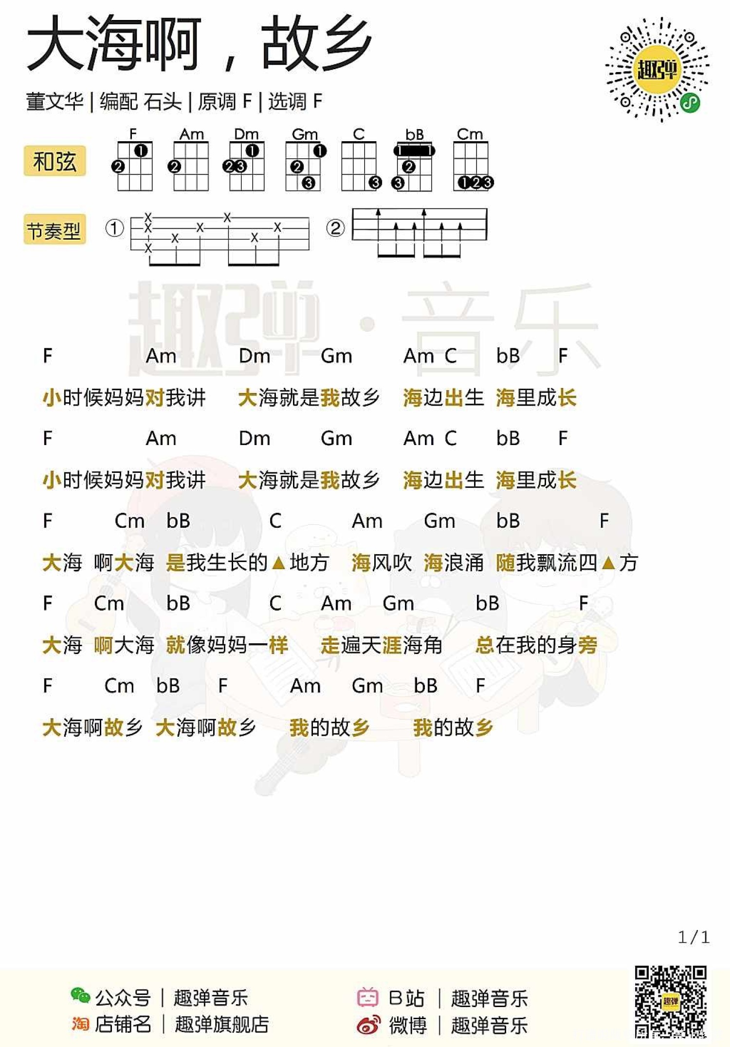 曲谱介绍: 董文华《大海啊,故乡》尤克里里谱,共有1张高清图谱,免翻页排版设计。