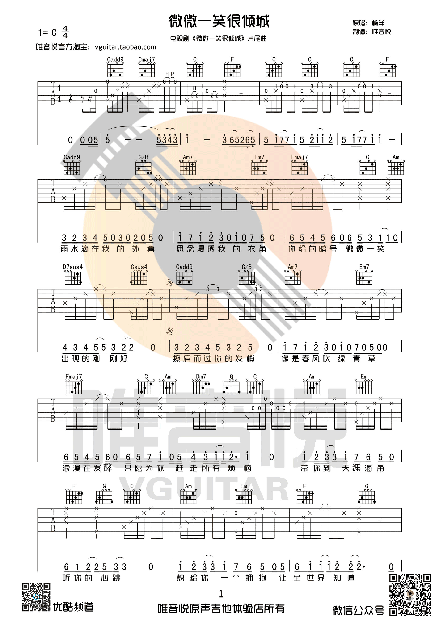 曲谱介绍: 杨洋《微微一笑很倾城》吉他弹唱谱,采用C调指法编配,唯音悦编配出品,共有2张高清图谱,免翻页排版设计。