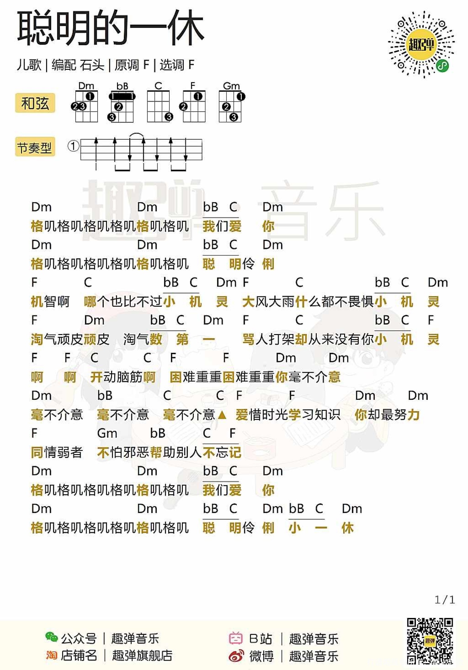 曲谱介绍: 儿歌《聪明的一休》尤克里里谱,共有1张高清图谱,免翻页排版设计。