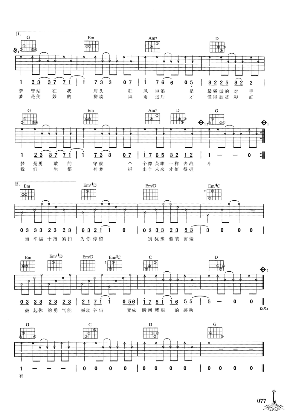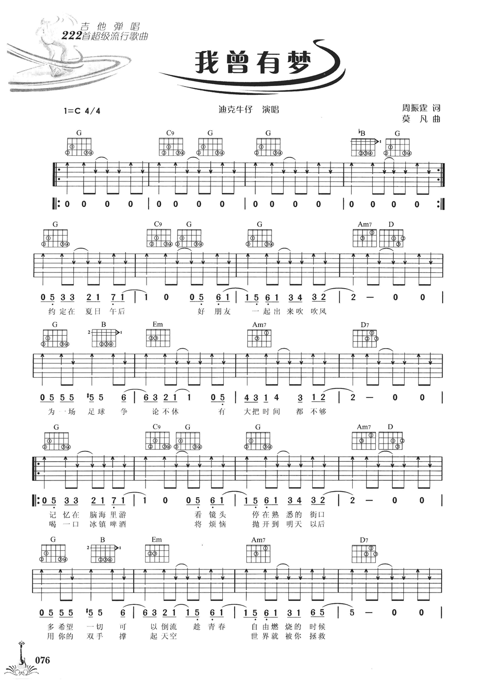 曲谱介绍: 迪克牛仔《我曾有梦》吉他弹唱谱,采用C调指法编配,共有2张高清图谱,免翻页排版设计。