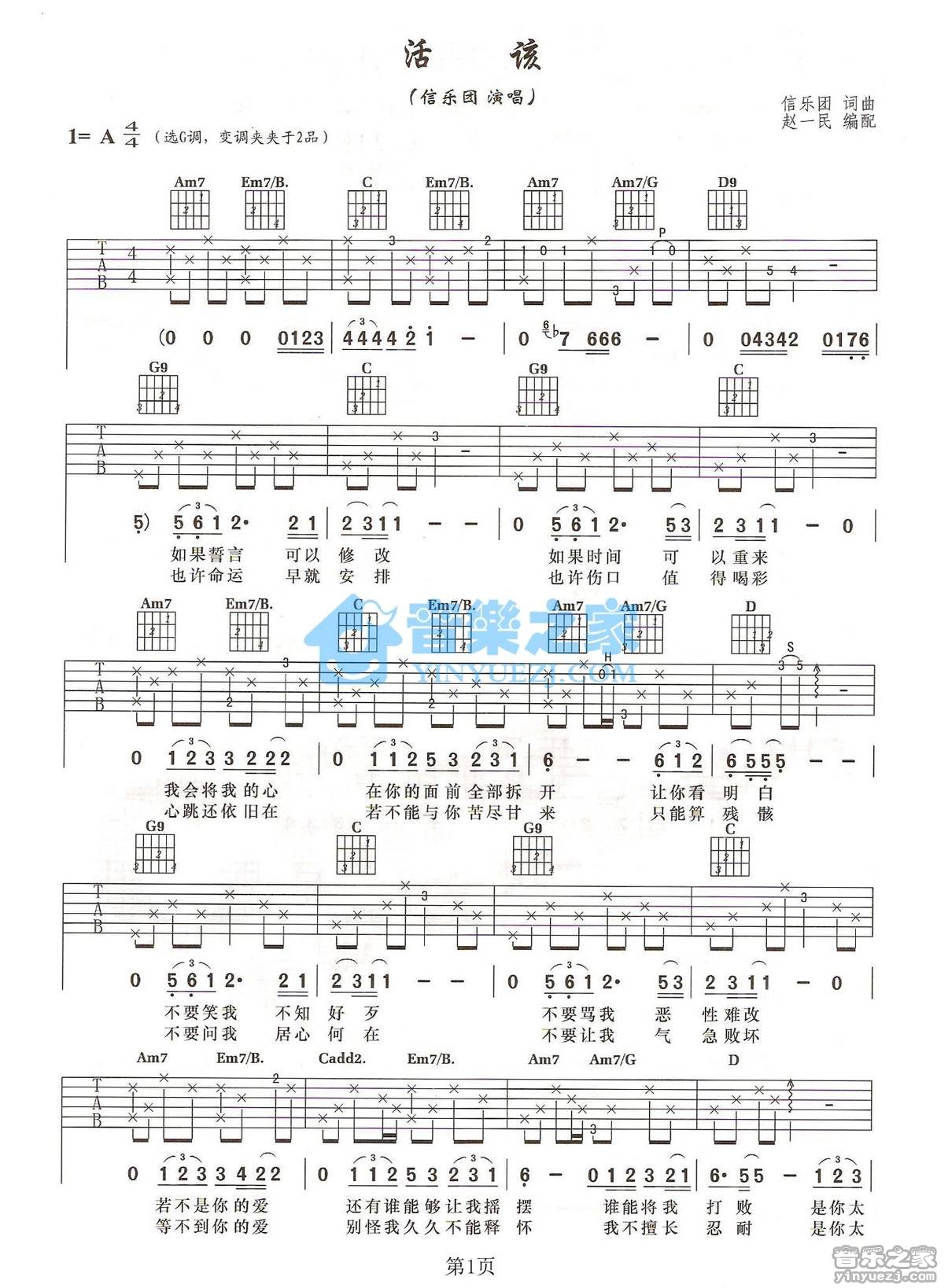 曲谱介绍: 信乐团《活该》吉他弹唱谱,采用A调指法编配,音乐之家编配出品,共有2张高清图谱,免翻页排版设计。
