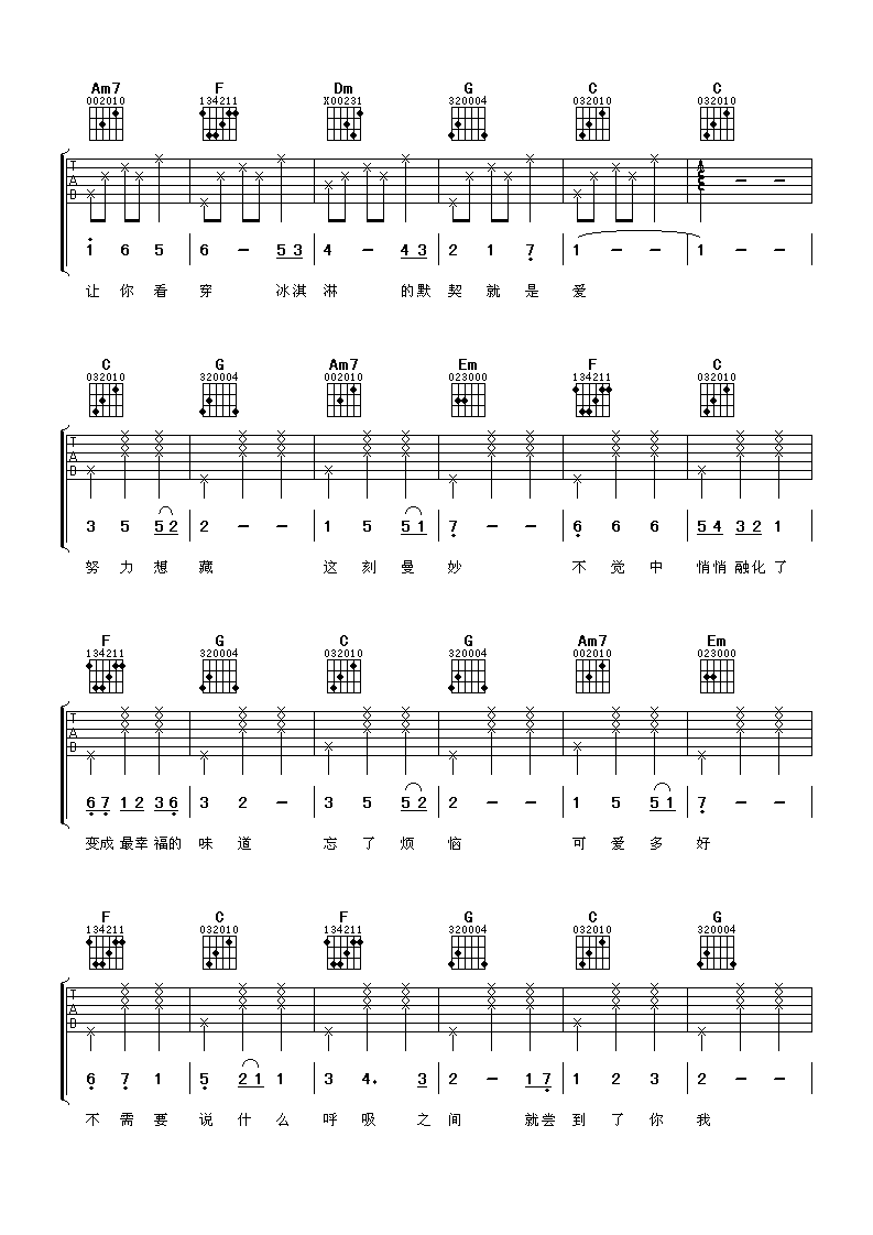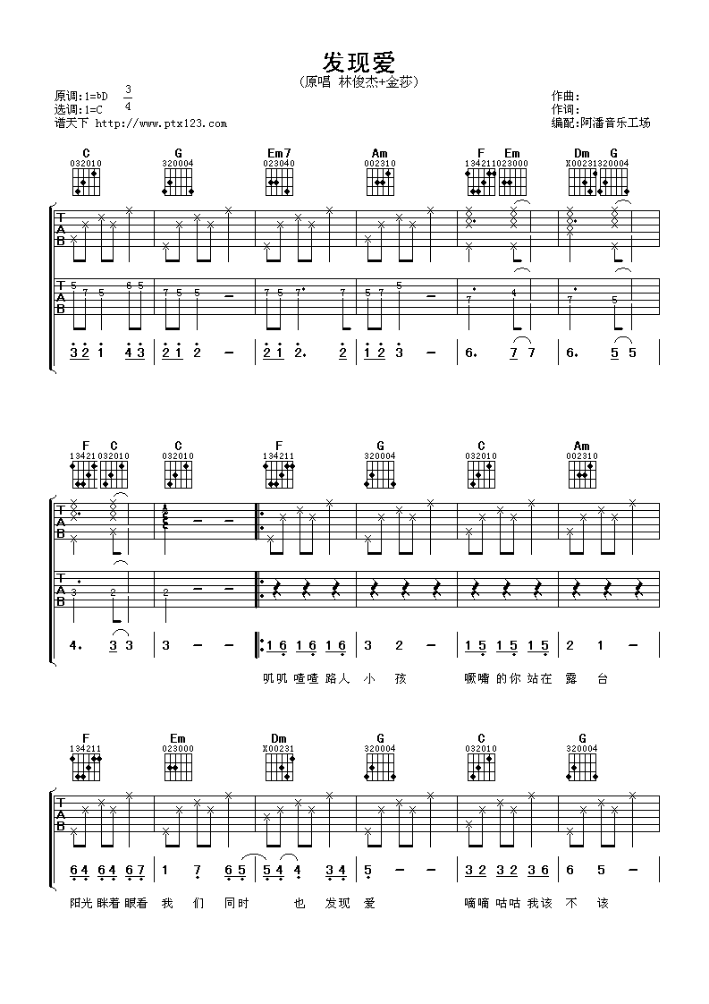 曲谱介绍: 林俊杰《发现爱》吉他弹唱谱,采用C调指法编配,阿潘音乐工场编配出品,共有4张高清图谱。