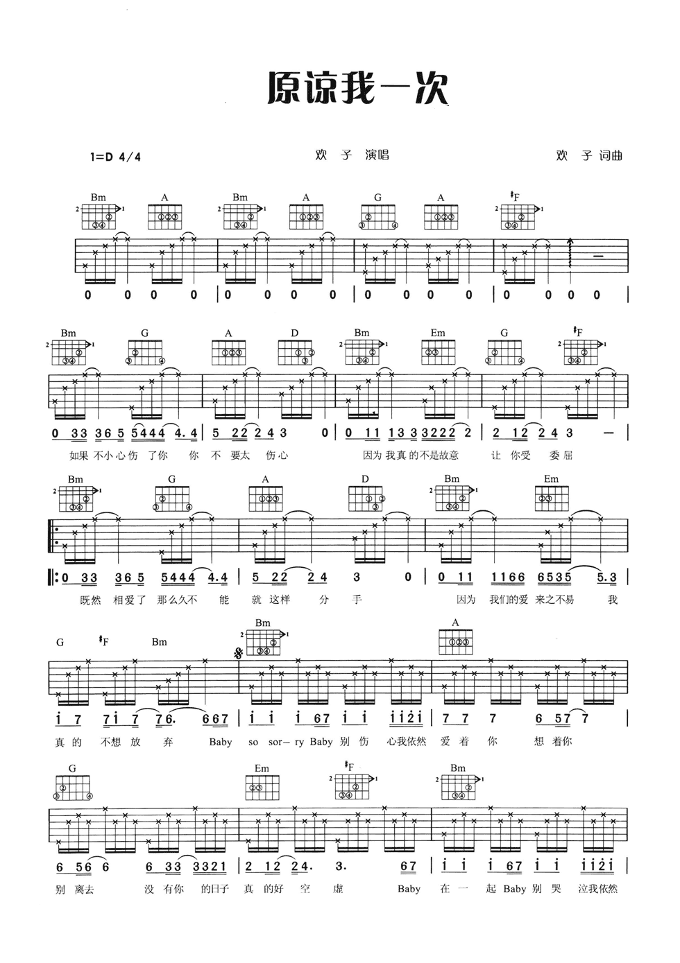 原谅我一次吉他谱 - 欢子 - D调吉他弹唱谱