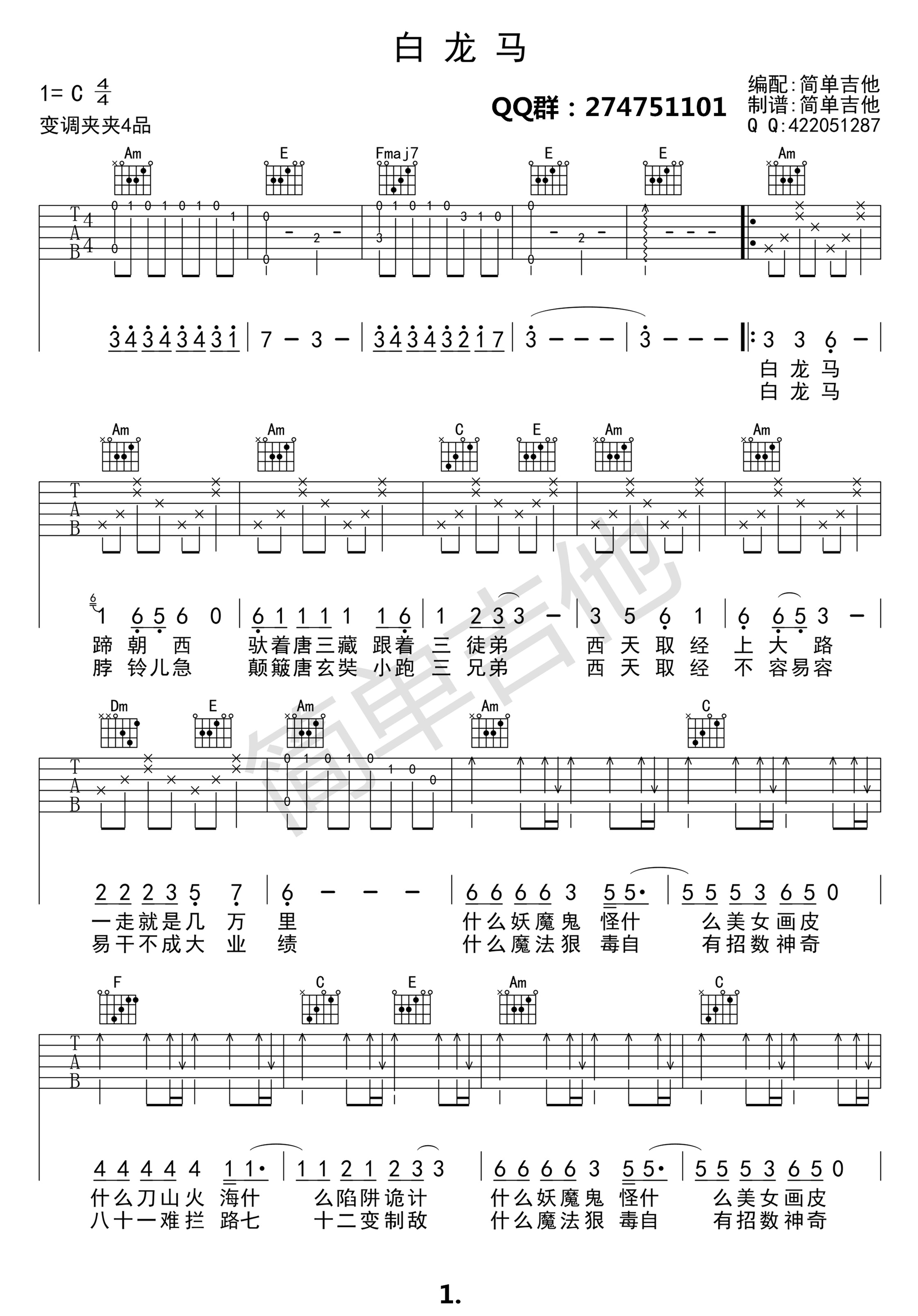 曲谱介绍: 吸引力组合《白龙马》吉他弹唱谱,采用C调指法编配,简单吉他编配出品,共有2张高清图谱,免翻页排版设计。