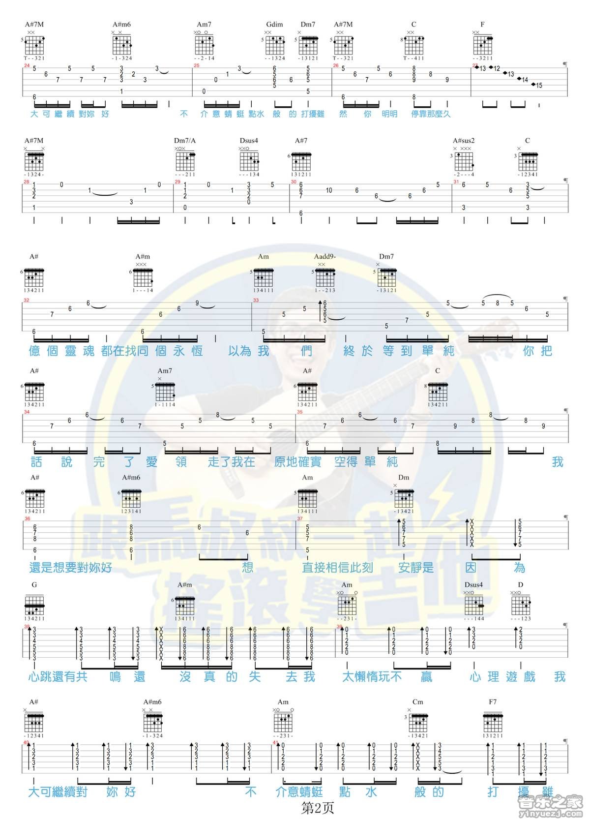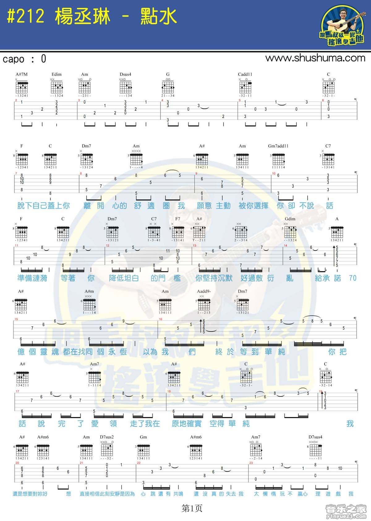 曲谱介绍: 杨丞琳《点水》吉他弹唱谱,采用C调指法编配,马叔叔编配出品,共有3张高清图谱。