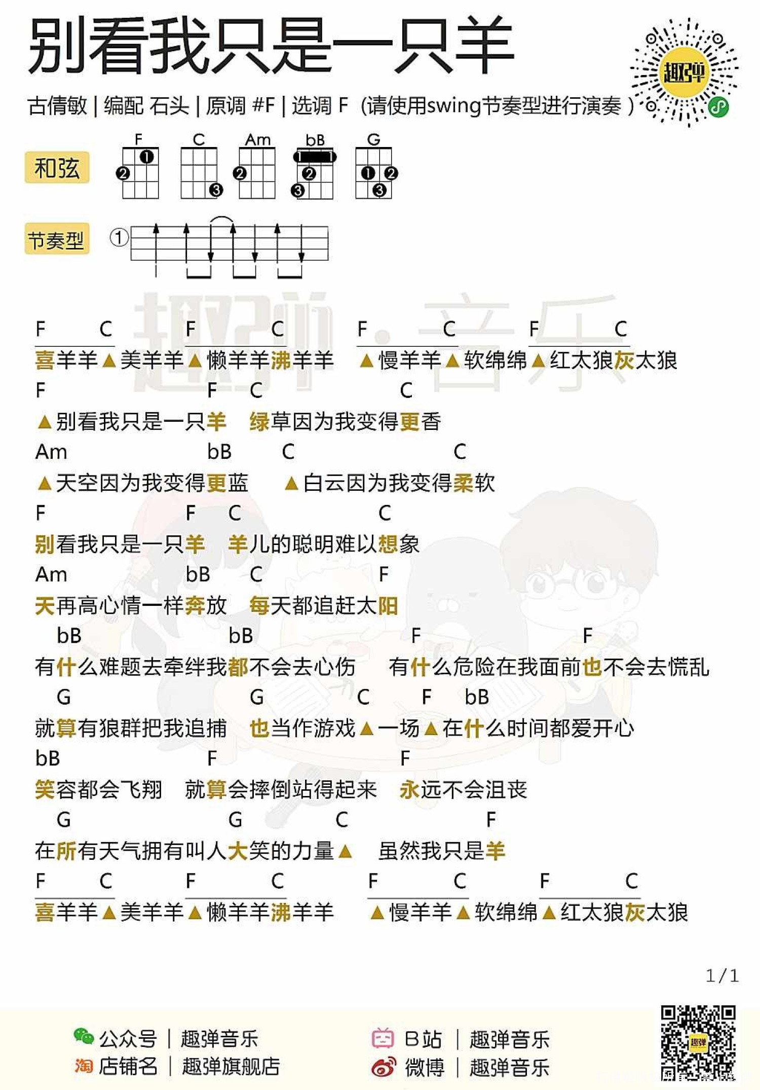 曲谱介绍: 喜羊羊《别看我只是一只羊》尤克里里谱,共有1张高清图谱,免翻页排版设计。