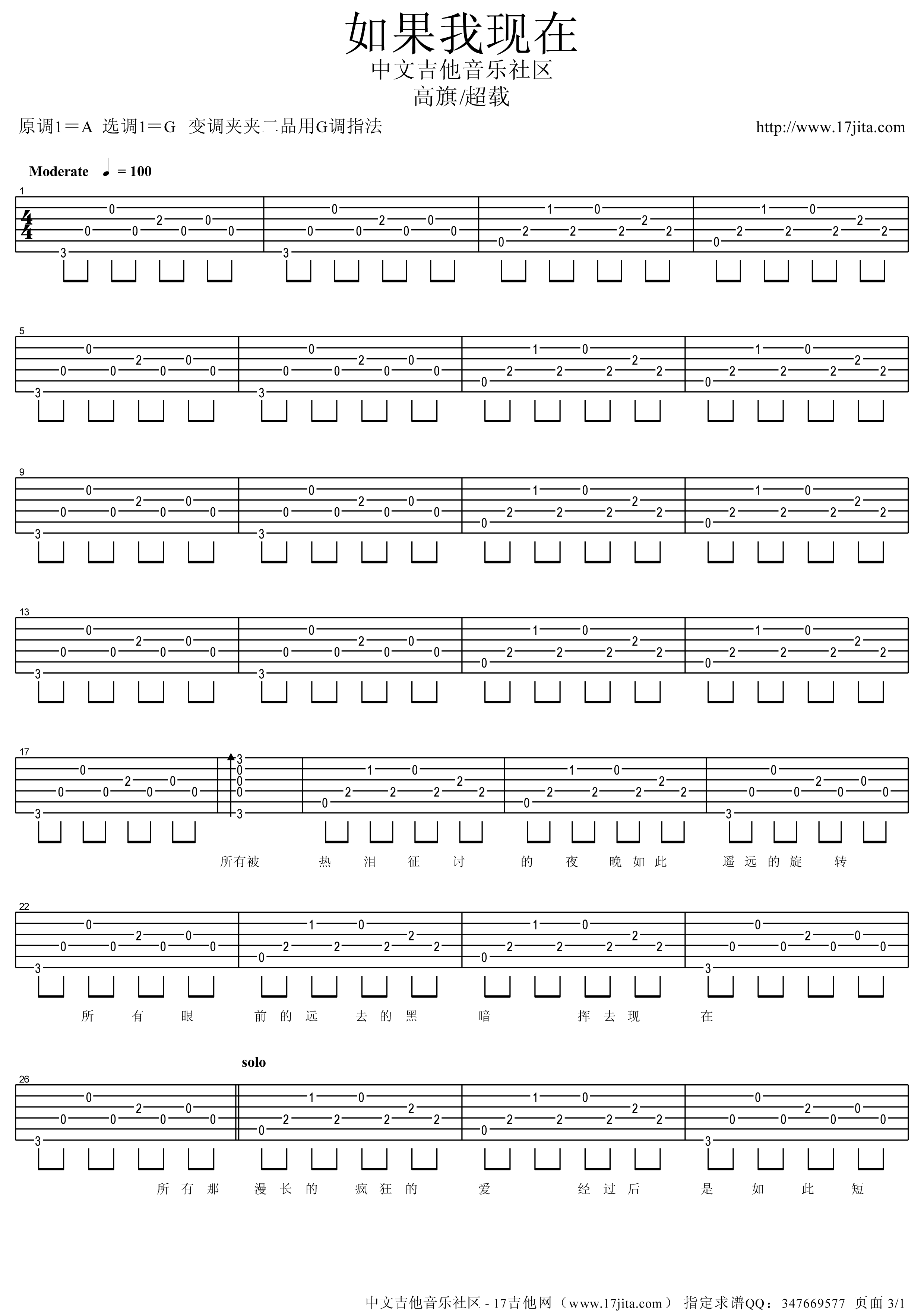 曲谱介绍: 超载乐队《如果我现在》吉他弹唱谱,采用G调指法编配,17吉他编配出品,共有3张高清图谱。