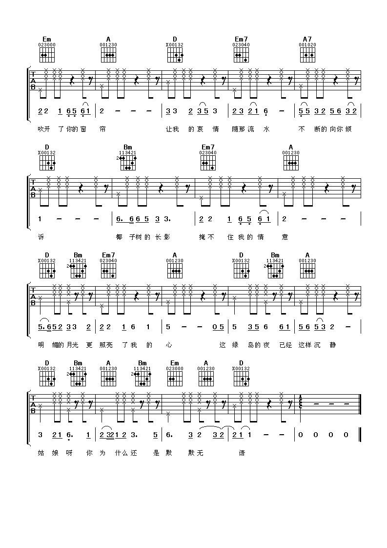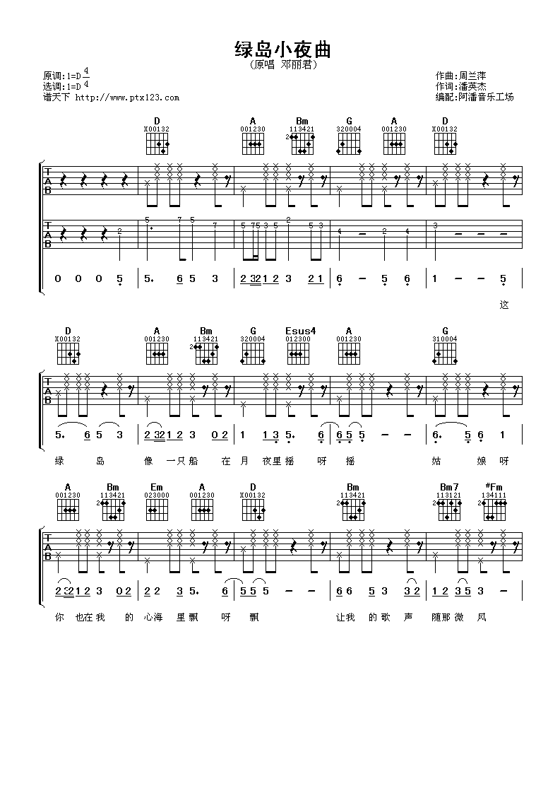 曲谱介绍: 邓丽君《绿岛小夜曲》吉他弹唱谱,采用D调指法编配,阿潘音乐工场编配出品,共有2张高清图谱,免翻页排版设计。