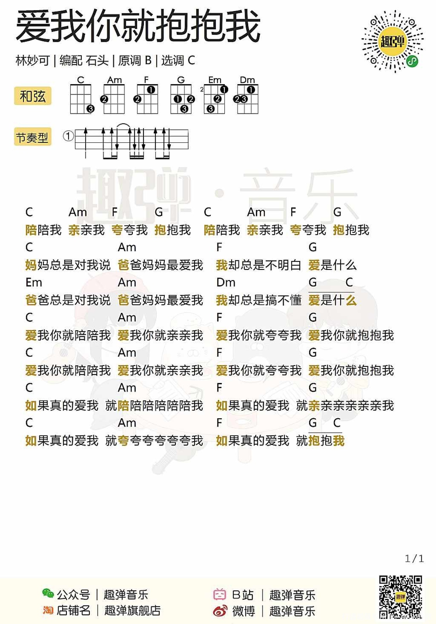 曲谱介绍: 林妙可《爱我你就抱抱我》尤克里里谱,共有1张高清图谱,免翻页排版设计。