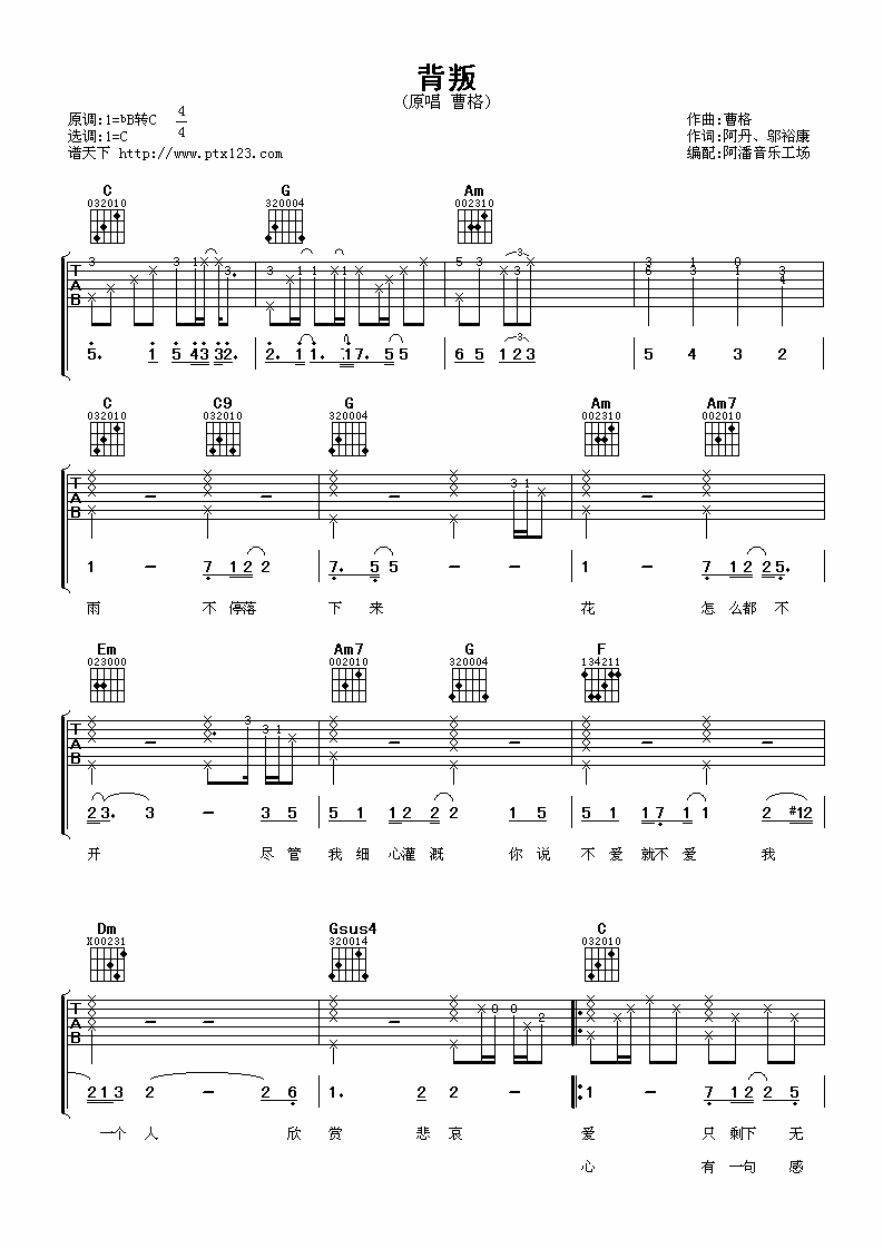 曲谱介绍: 曹格《背叛》吉他弹唱谱,采用C调指法编配,阿潘音乐工场编配出品,共有3张高清图谱。