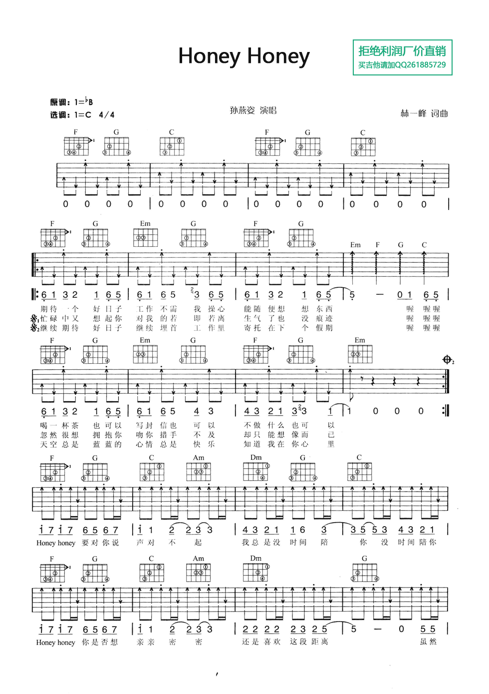 曲谱介绍: Honey《HoneyHoney》吉他弹唱谱,采用C调指法编配,共有2张高清图谱,免翻页排版设计。