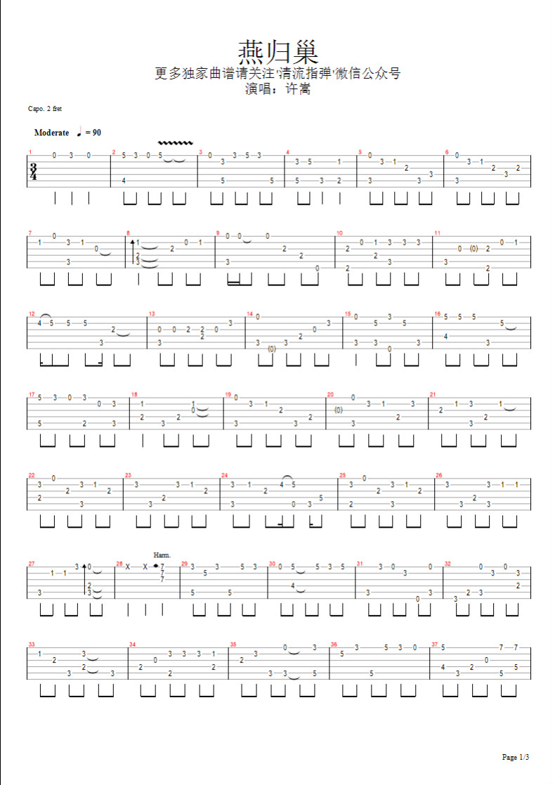 曲谱介绍: 许嵩《燕归巢》吉他独奏谱,清流指弹编配出品,共有3张高清图谱。