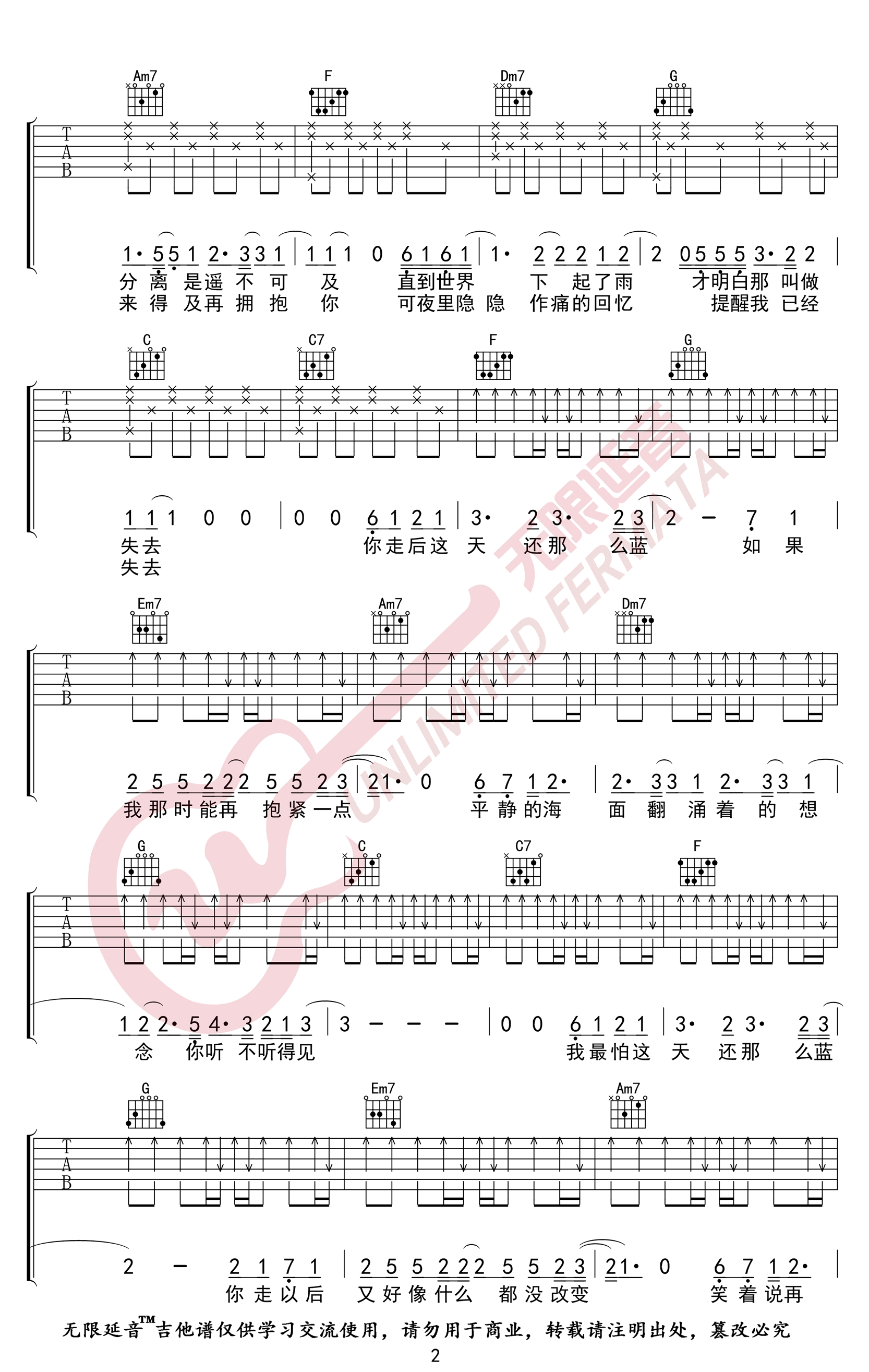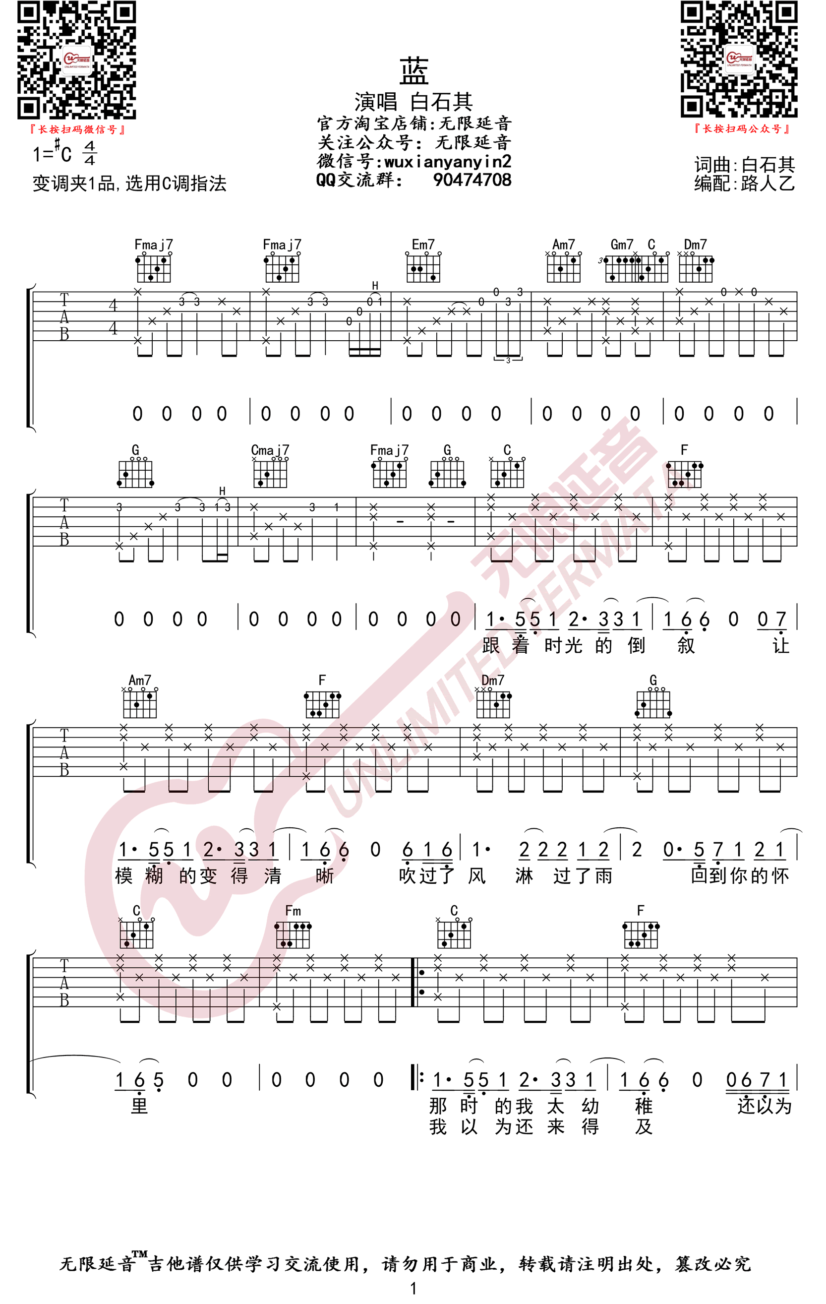 曲谱介绍: 石白其《蓝》吉他弹唱谱,采用C调指法编配,无限延音编配出品,共有3张高清图谱。