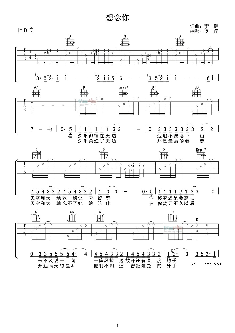 想念你吉他谱 - 李健 - D调吉他弹唱谱