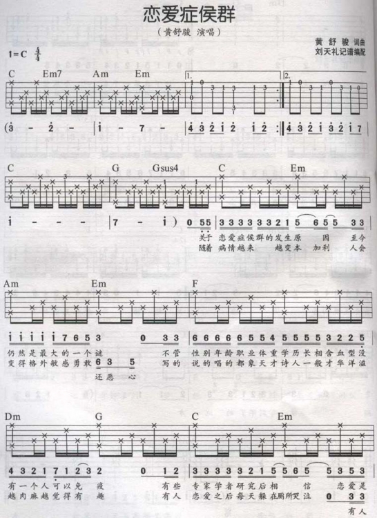 曲谱介绍: 黄舒骏《恋爱症候群》吉他弹唱谱,采用C调指法编配,刘天礼记编配出品,共有7张高清图谱。