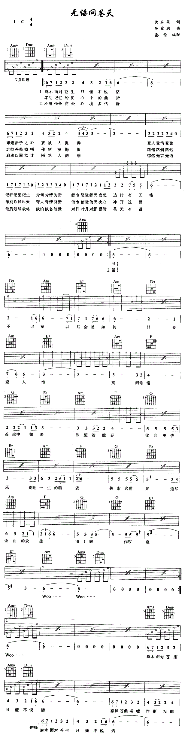 曲谱介绍: Beyond《无语问苍天》吉他弹唱谱,采用C调指法编配,秦智编配出品,共有1张高清图谱,免翻页排版设计。