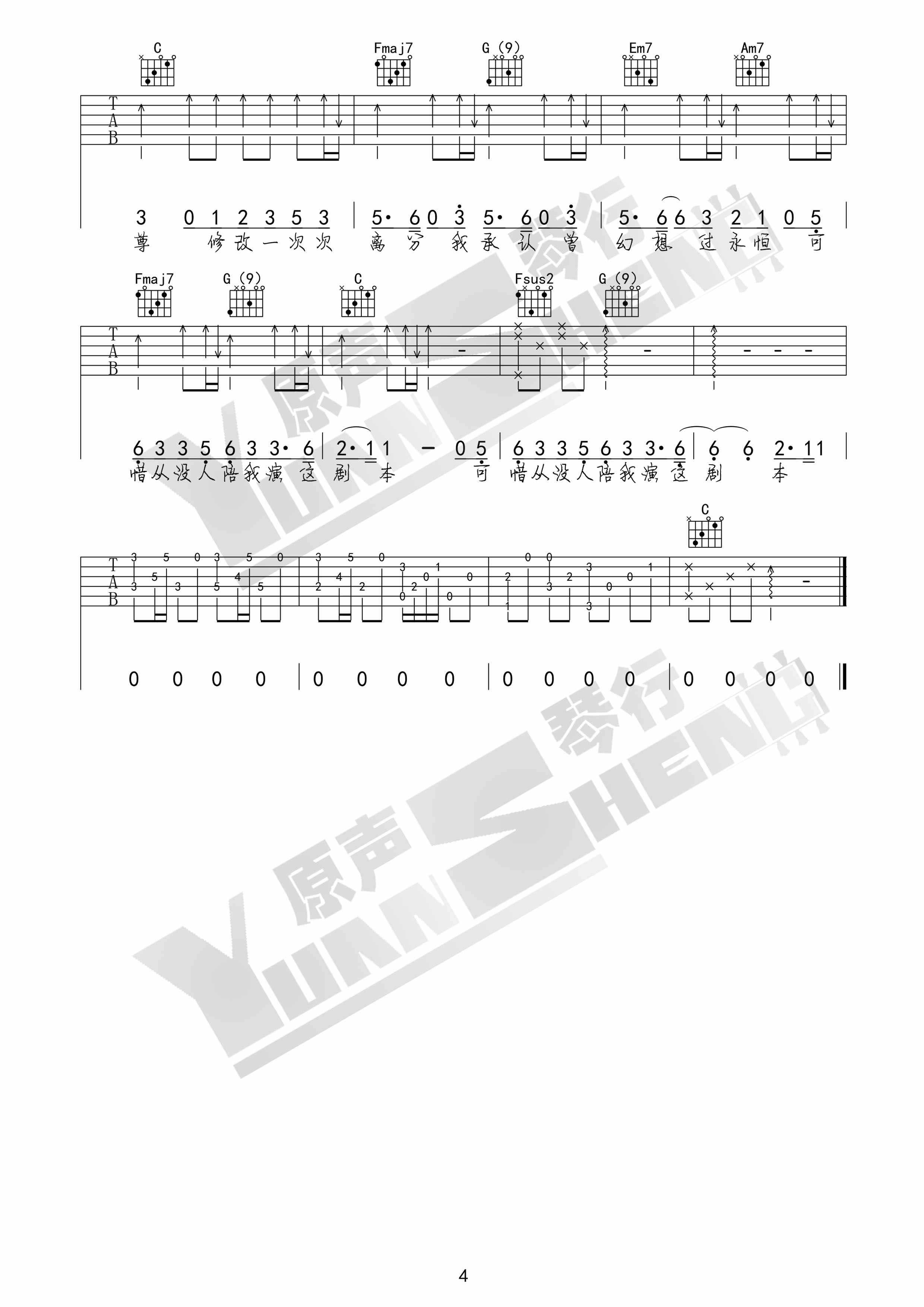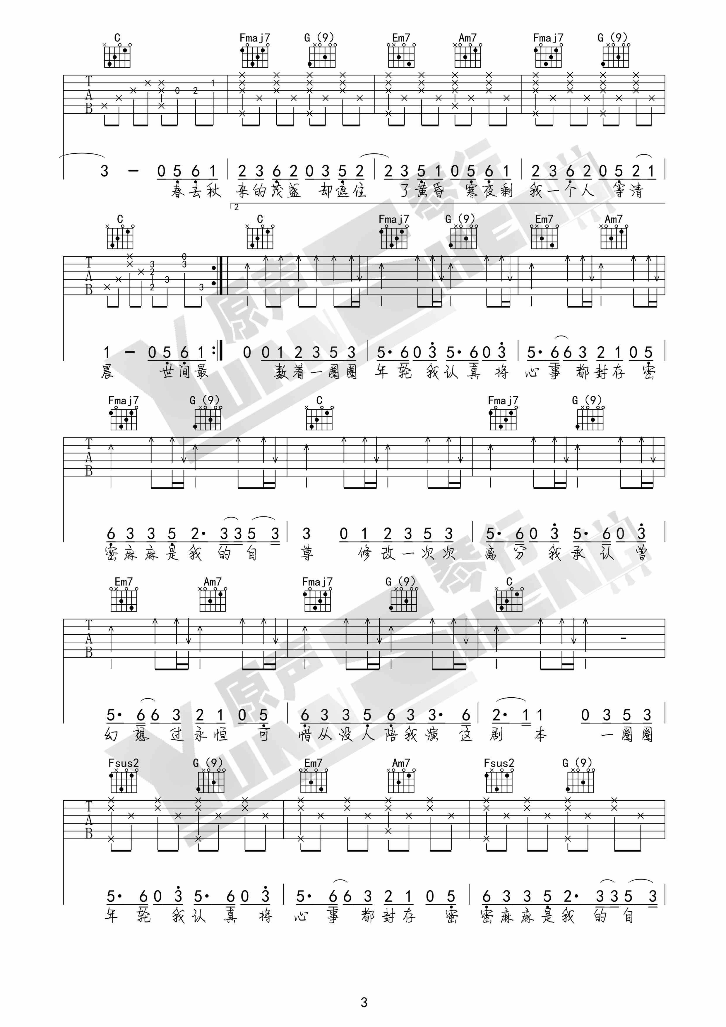 曲谱介绍: 张碧晨《年轮》吉他弹唱谱,采用C调指法编配,原声琴行编配出品,共有4张高清图谱。