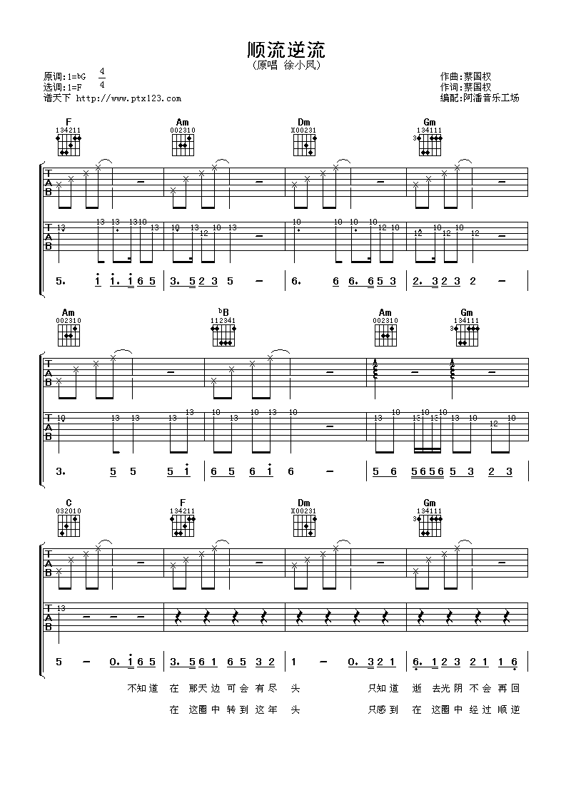 曲谱介绍: 徐小凤《顺流逆流》吉他弹唱谱,采用F调指法编配,阿潘音乐工场编配出品,共有3张高清图谱。