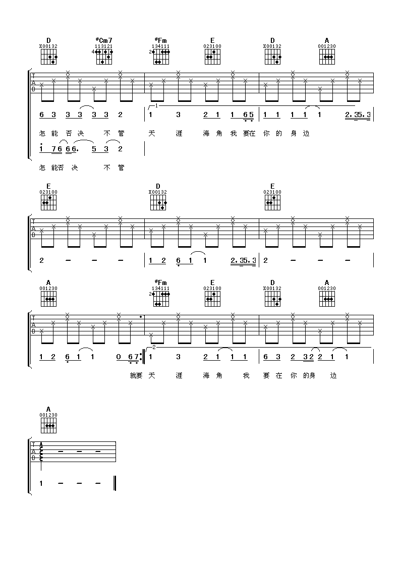 曲谱介绍: 张学友《在你身边》吉他弹唱谱,采用A调指法编配,阿潘音乐工场编配出品,共有3张高清图谱。