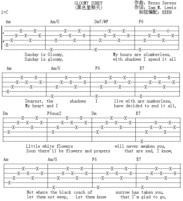 曲谱介绍: 鲁兰斯·查理斯《黑色星期天》吉他弹唱谱,采用C调指法编配,KEEN编配出品,共有4张高清图谱。