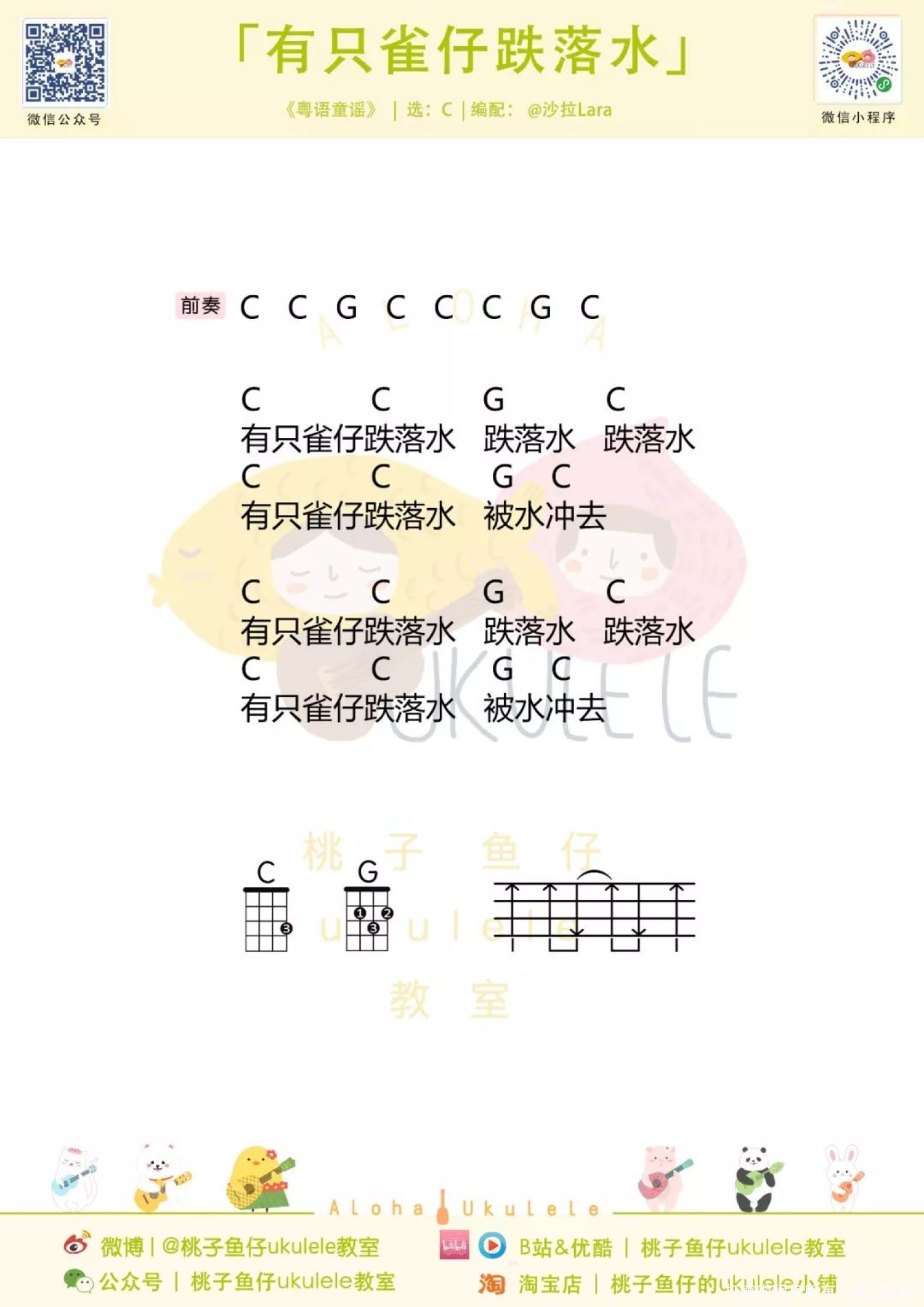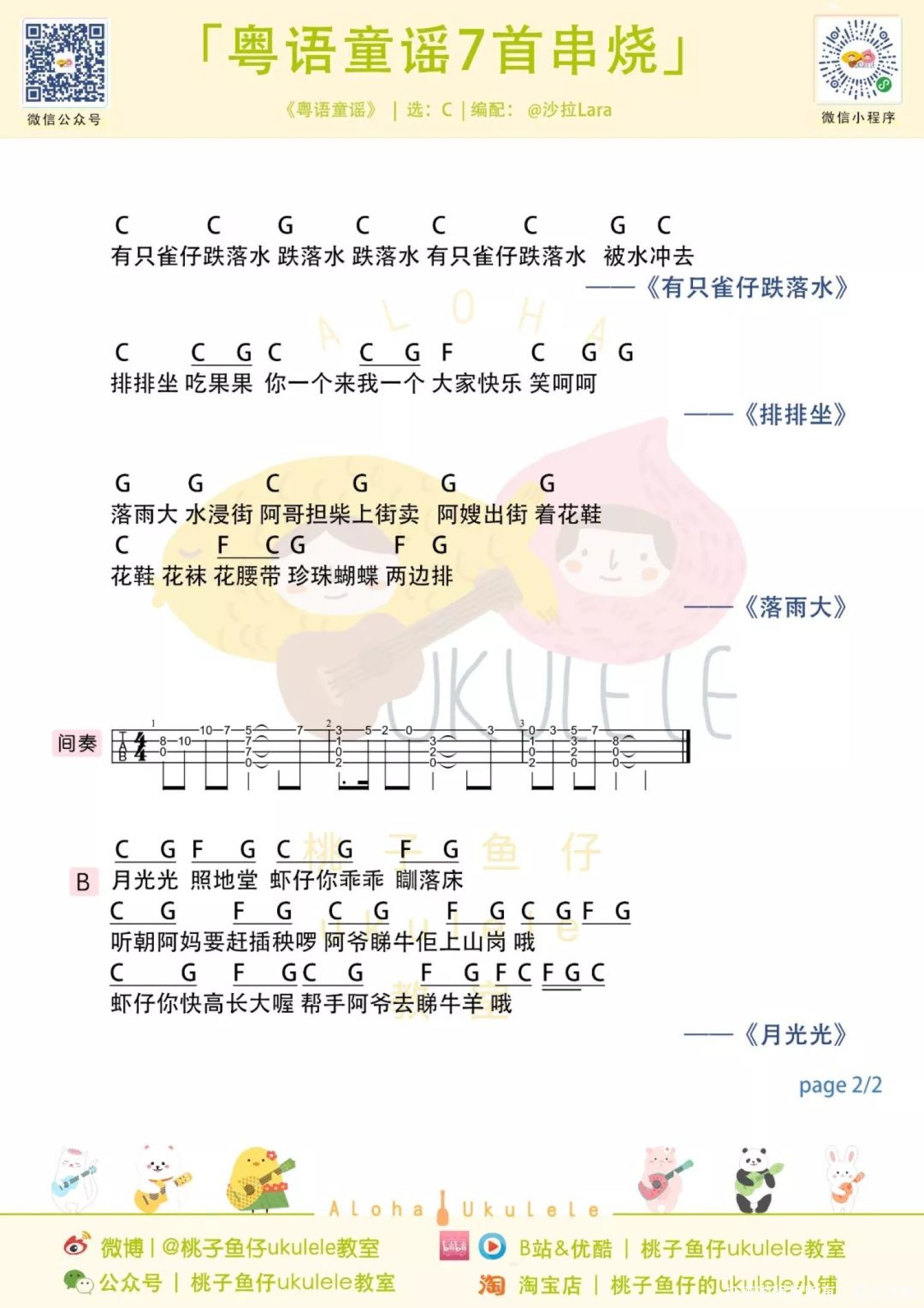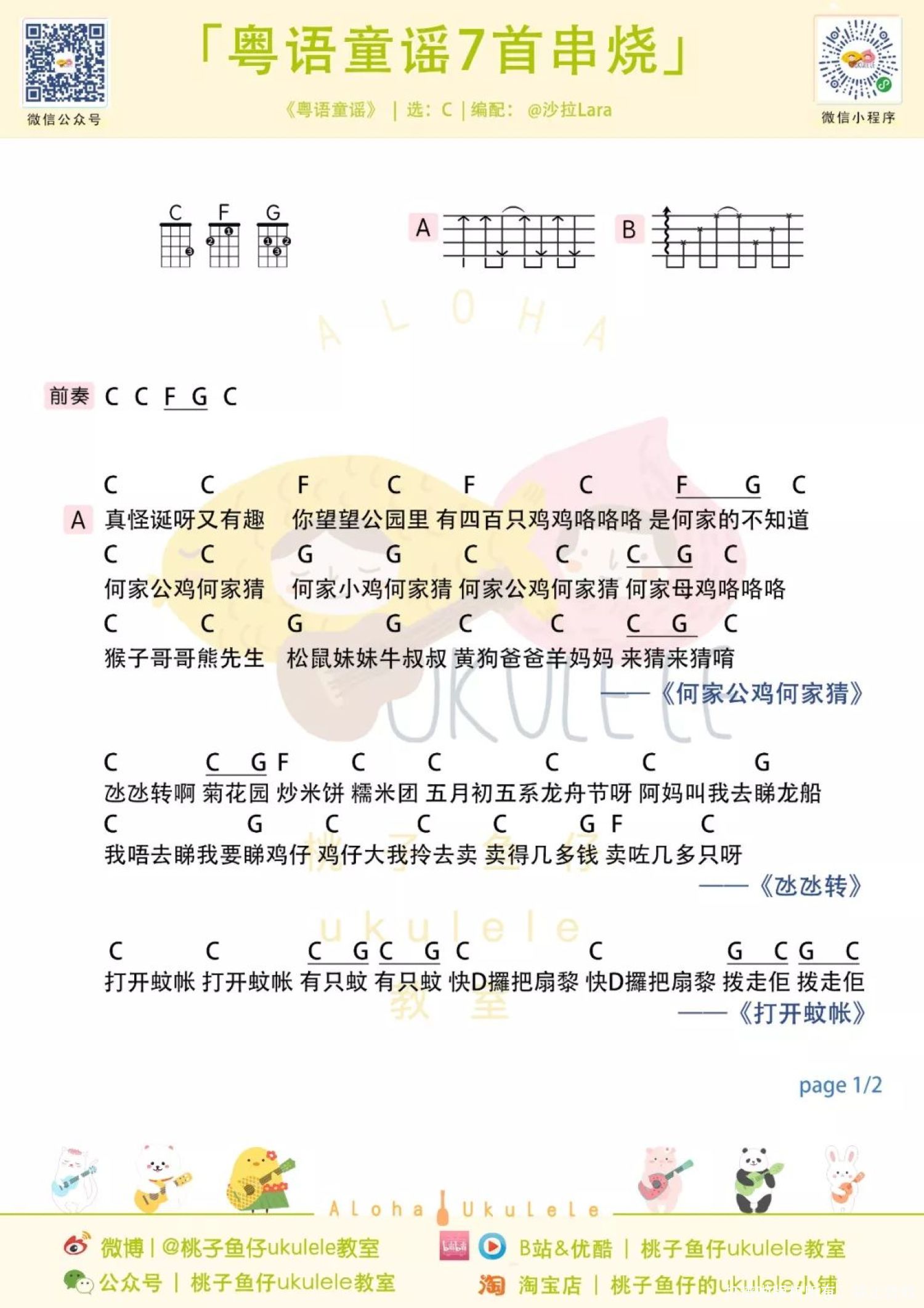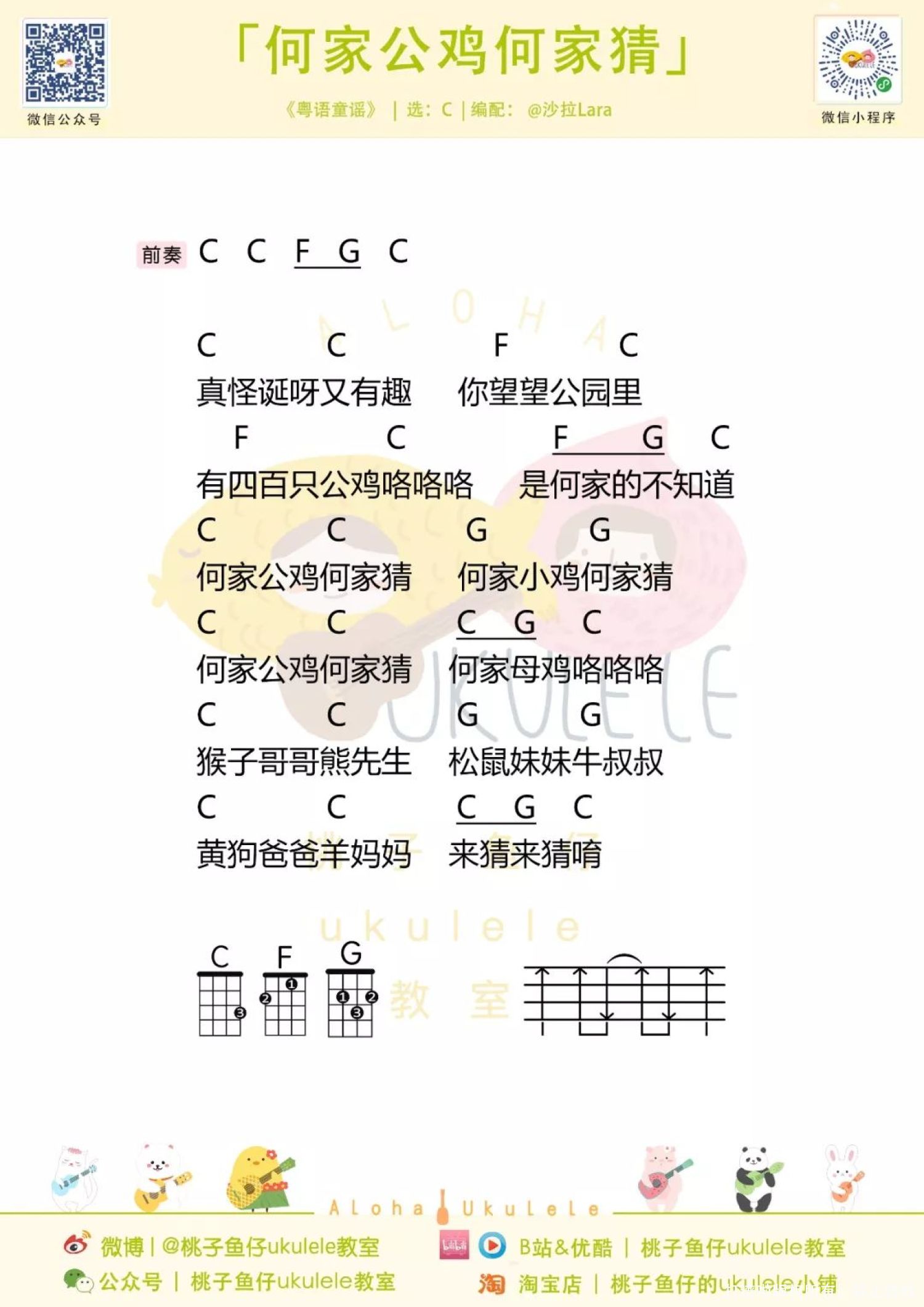 曲谱介绍: ukulele 弹唱演示 ukulele弹唱教学 串 烧 谱 完整尤克里里歌谱 目录 六一儿童节快乐 aloha~ 各位童心未泯的琴友们六一快乐 今天沙拉老师送上超经典的粤语童谣 带大家提前快乐过节~ 当你听到这些熟悉的旋律的时候 有没有想起小时候 那些年最美好的回忆 你最记得的儿时童谣又是什么   ukulele 弹唱演示   ukulele弹唱教学   串 烧 谱   完整尤克里里歌谱 1、何家公鸡何家猜 这是一首可爱又怪诞的幼年童年~ 许多小朋友都会又唱又跳~   2、氹氹转 看龙船 炒米饼,这就是广东地区小朋友的端午印象。但是小朋友都宁愿去看鸡仔也不愿意去看龙舟晒热闹呀。因为等着带小鸡仔长大带去卖钱~   3、打开蚊帐 夏天来到~清风 薄扇 蚊子 蚊帐构成了一副夏季超写实童谣。粤语儿歌《打开蚊帐》,调寄法文儿歌《Frère Jacques》,意即《雅克兄弟》。   4、有只雀仔跌落水 有只雀仔跌落水 跌落水 跌落水 有只雀仔跌落水 被水冲去 这首歌简直对小朋友来说简直是就是信手拈来哦~   5、排排坐 排排坐,吃果果,你一个来我一个 ...... 调皮好动的小朋友也只有在吃果果的时候才会乖乖的排排坐啦~   6、落雨大 相信《落雨大》是很多老广的童年记忆。几乎每个小朋友都是哼唱这首童谣,每逢水浸街,一定会跑出去玩水,玩到整身都湿透了。《落雨大》就这样哗啦哗啦滑进了懵懂的童年~   7、月光光 这首《月光光》也是大家耳熟能详的儿歌了。是广州地区小朋友的摇篮曲~ 不知道你小时候是不是也像歌里的虾仔一样,不肯睡觉被妈妈唱着这首歌哄着入睡呢?   END
