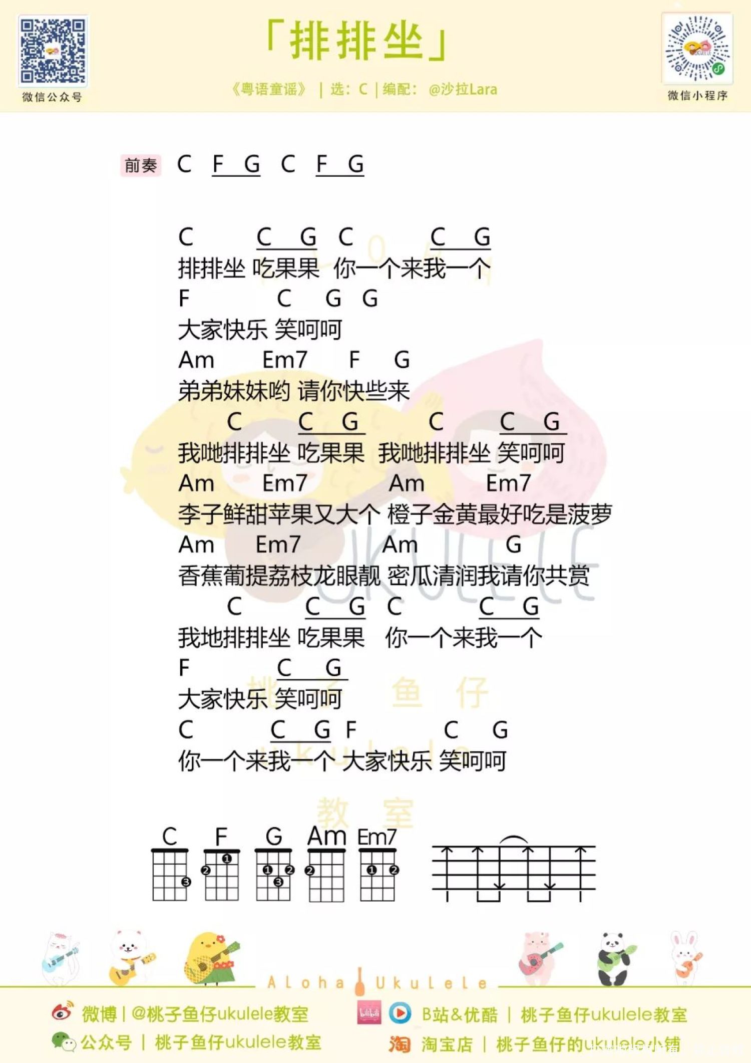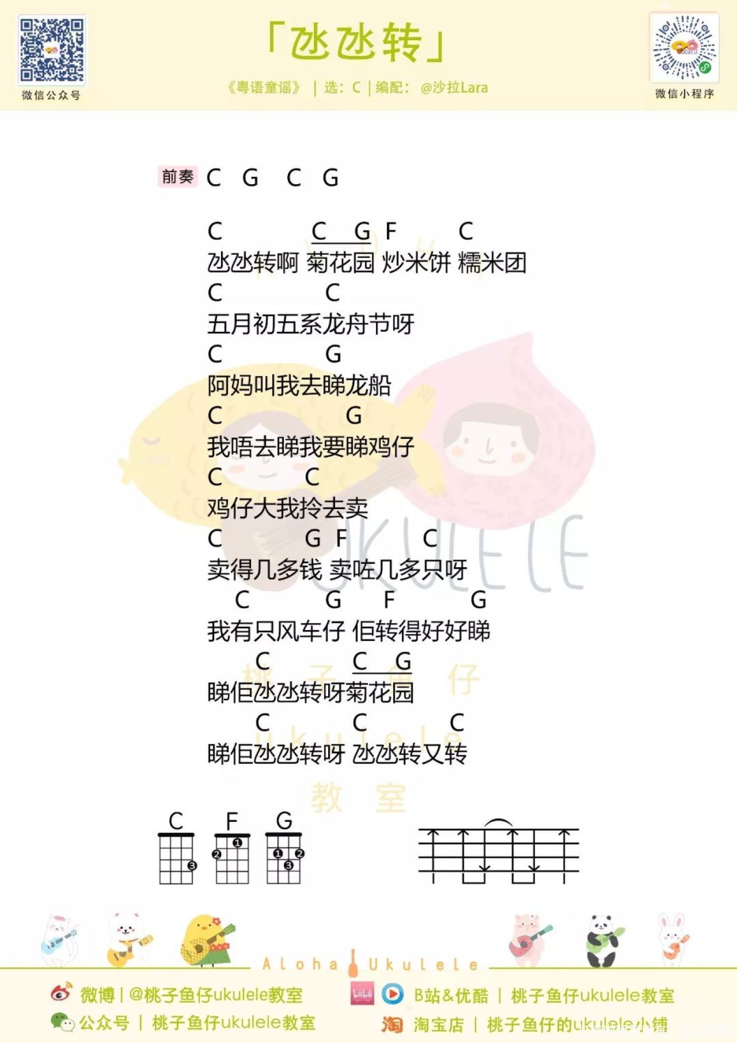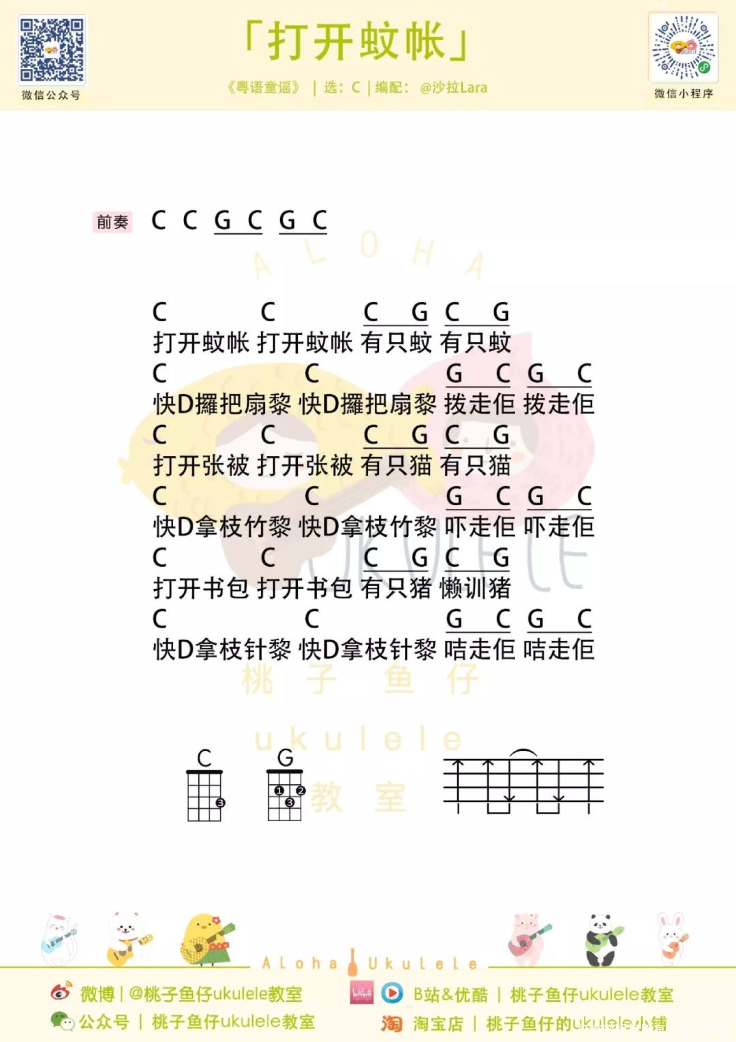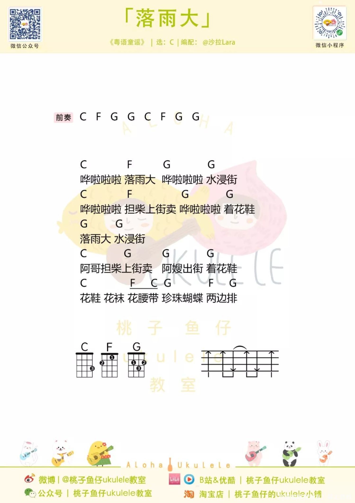 曲谱介绍: ukulele 弹唱演示 ukulele弹唱教学 串 烧 谱 完整尤克里里歌谱 目录 六一儿童节快乐 aloha~ 各位童心未泯的琴友们六一快乐 今天沙拉老师送上超经典的粤语童谣 带大家提前快乐过节~ 当你听到这些熟悉的旋律的时候 有没有想起小时候 那些年最美好的回忆 你最记得的儿时童谣又是什么   ukulele 弹唱演示   ukulele弹唱教学   串 烧 谱   完整尤克里里歌谱 1、何家公鸡何家猜 这是一首可爱又怪诞的幼年童年~ 许多小朋友都会又唱又跳~   2、氹氹转 看龙船 炒米饼,这就是广东地区小朋友的端午印象。但是小朋友都宁愿去看鸡仔也不愿意去看龙舟晒热闹呀。因为等着带小鸡仔长大带去卖钱~   3、打开蚊帐 夏天来到~清风 薄扇 蚊子 蚊帐构成了一副夏季超写实童谣。粤语儿歌《打开蚊帐》,调寄法文儿歌《Frère Jacques》,意即《雅克兄弟》。   4、有只雀仔跌落水 有只雀仔跌落水 跌落水 跌落水 有只雀仔跌落水 被水冲去 这首歌简直对小朋友来说简直是就是信手拈来哦~   5、排排坐 排排坐,吃果果,你一个来我一个 ...... 调皮好动的小朋友也只有在吃果果的时候才会乖乖的排排坐啦~   6、落雨大 相信《落雨大》是很多老广的童年记忆。几乎每个小朋友都是哼唱这首童谣,每逢水浸街,一定会跑出去玩水,玩到整身都湿透了。《落雨大》就这样哗啦哗啦滑进了懵懂的童年~   7、月光光 这首《月光光》也是大家耳熟能详的儿歌了。是广州地区小朋友的摇篮曲~ 不知道你小时候是不是也像歌里的虾仔一样,不肯睡觉被妈妈唱着这首歌哄着入睡呢?   END