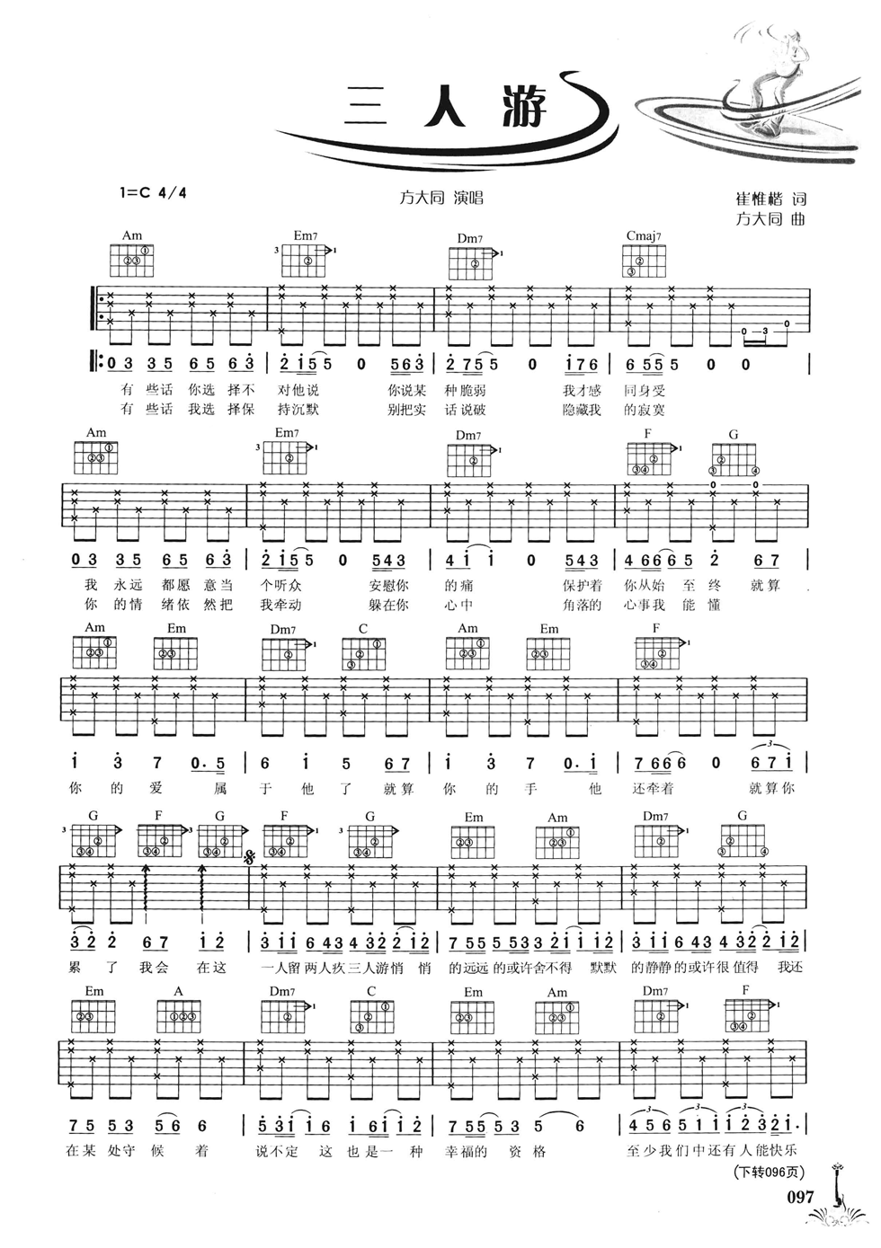 曲谱介绍: 方大同《三人游》吉他弹唱谱,采用C调指法编配,共有2张高清图谱,免翻页排版设计。