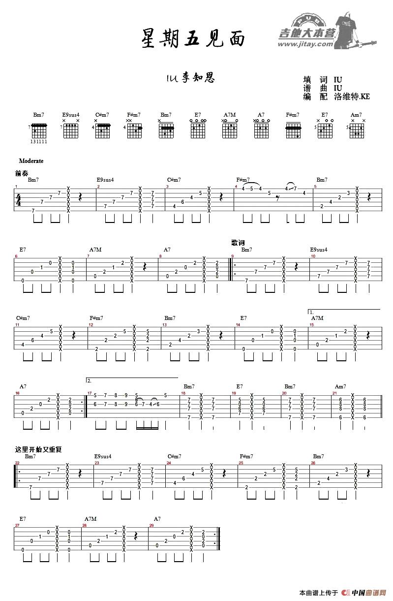 曲谱介绍: ​IU《星期五见面》吉他弹唱谱,采用B调指法编配,中国曲谱网编配出品,共有1张高清图谱,免翻页排版设计。