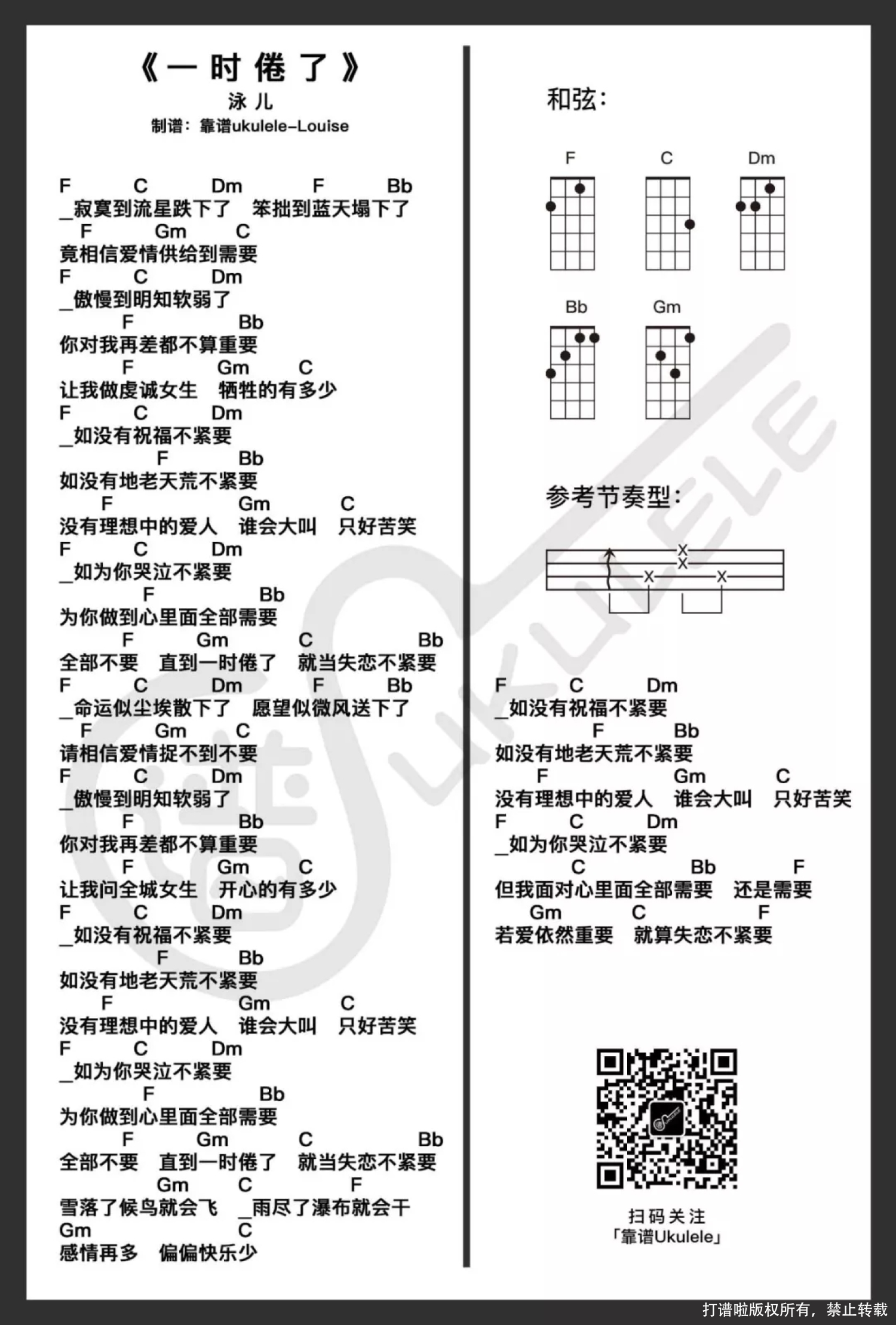 曲谱介绍: 这是一首蛮早之前的求谱歌……Emmmmm,不得不说求谱时间有点久了,不知道求谱的小伙伴还记得吗?应该还在的吧~ 因为求谱拖延症的关系,现在也很少接求谱曲了,如果有想求谱的小伙伴,依旧可以留言,我会把消息记录收藏下来,至于什么时候分享嘛~就很难说了,有可能根据留言比较多的歌先考虑也不一定,Louise做事还蛮随心的,没有特别规则在,开心最重要~。   难度系数:★☆ 整首歌有一个基本的和弦编配F-C-Dm-F-Bb-F-Gm-C,差不多就是一直循环就够。 除了Bb稍微有难度一点,其他和弦基本上算是比较常见的。 总的来说这首歌不难,你们粤语肯定都比我强哈哈哈哈哈,我是真的不擅长……〒▽〒   「一时倦了」尤克里里弹唱谱