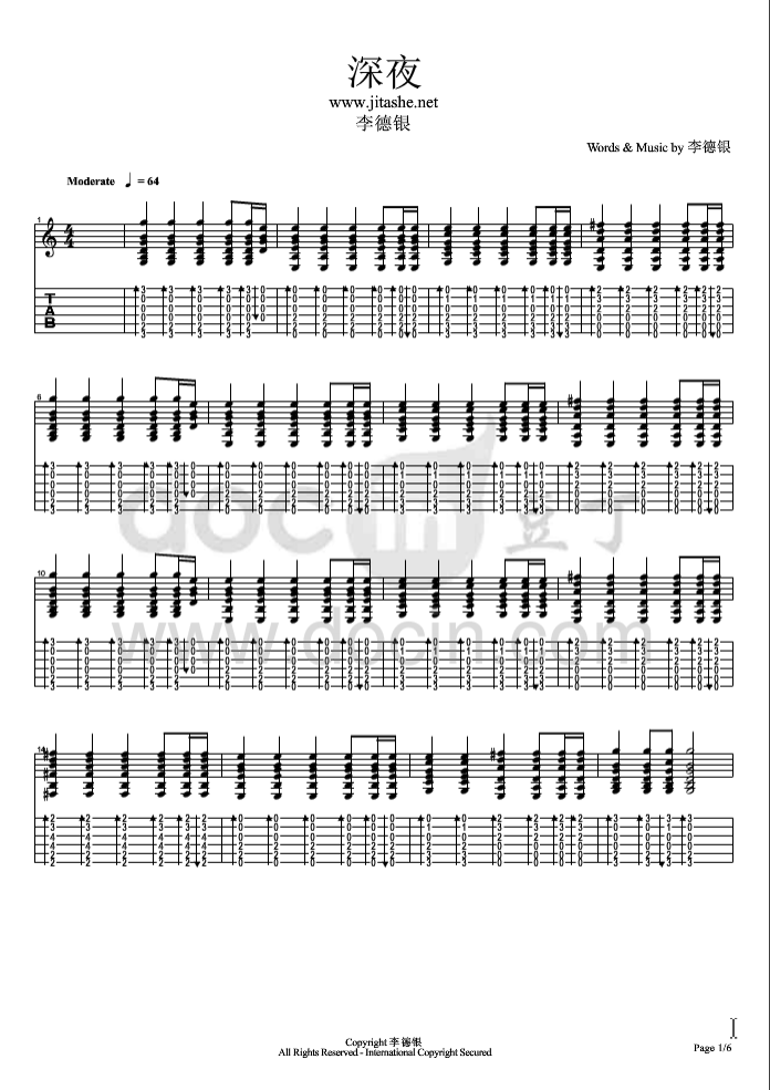 曲谱介绍: 李德银《深夜》吉他弹唱谱,采用C调指法编配,豆丁网编配出品,共有6张高清图谱。