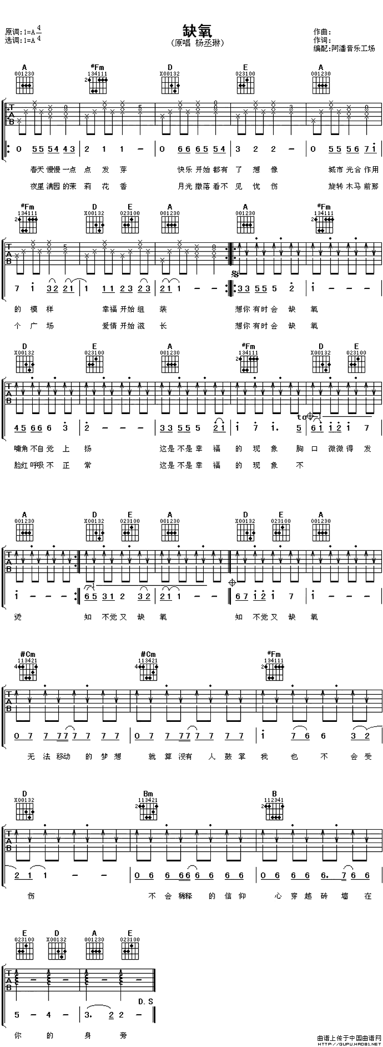 曲谱介绍: 杨丞琳《缺氧》吉他弹唱谱,采用A调指法编配,阿潘音乐工场编配出品,共有1张高清图谱,免翻页排版设计。