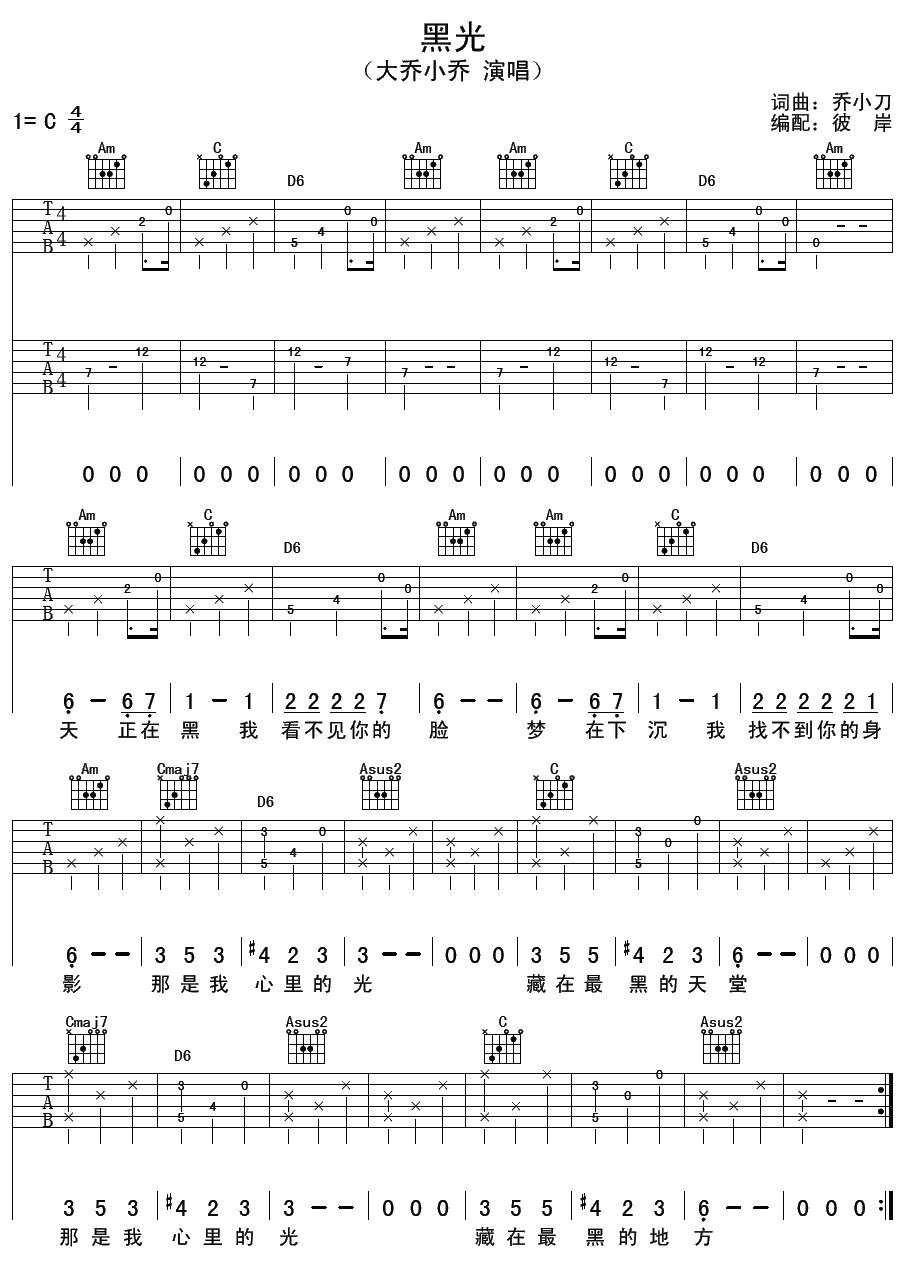 曲谱介绍: 大乔小乔《黑光》吉他弹唱谱,采用C调指法编配,彼岸吉他编配出品,共有1张高清图谱,免翻页排版设计。