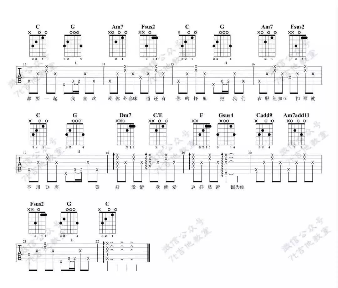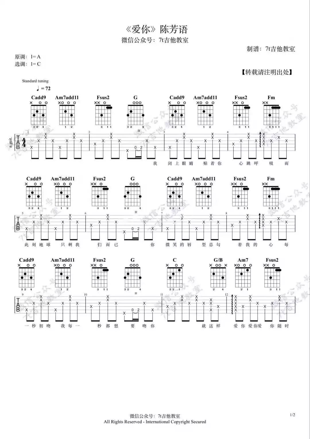 曲谱介绍: 陈芳语《爱你》吉他弹唱谱,采用C调指法编配,7t吉他教室编配出品,共有2张高清图谱,免翻页排版设计。