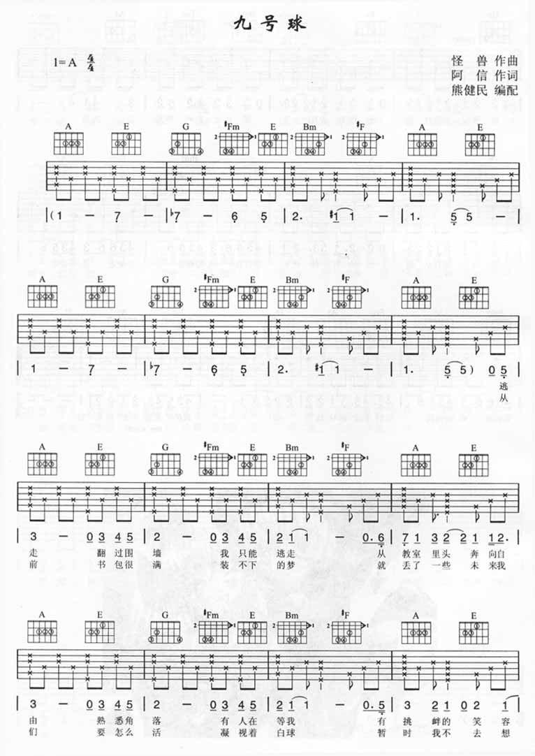 曲谱介绍: 五月天《九号球》吉他弹唱谱,采用A调指法编配,熊健民编配出品,共有2张高清图谱,免翻页排版设计。