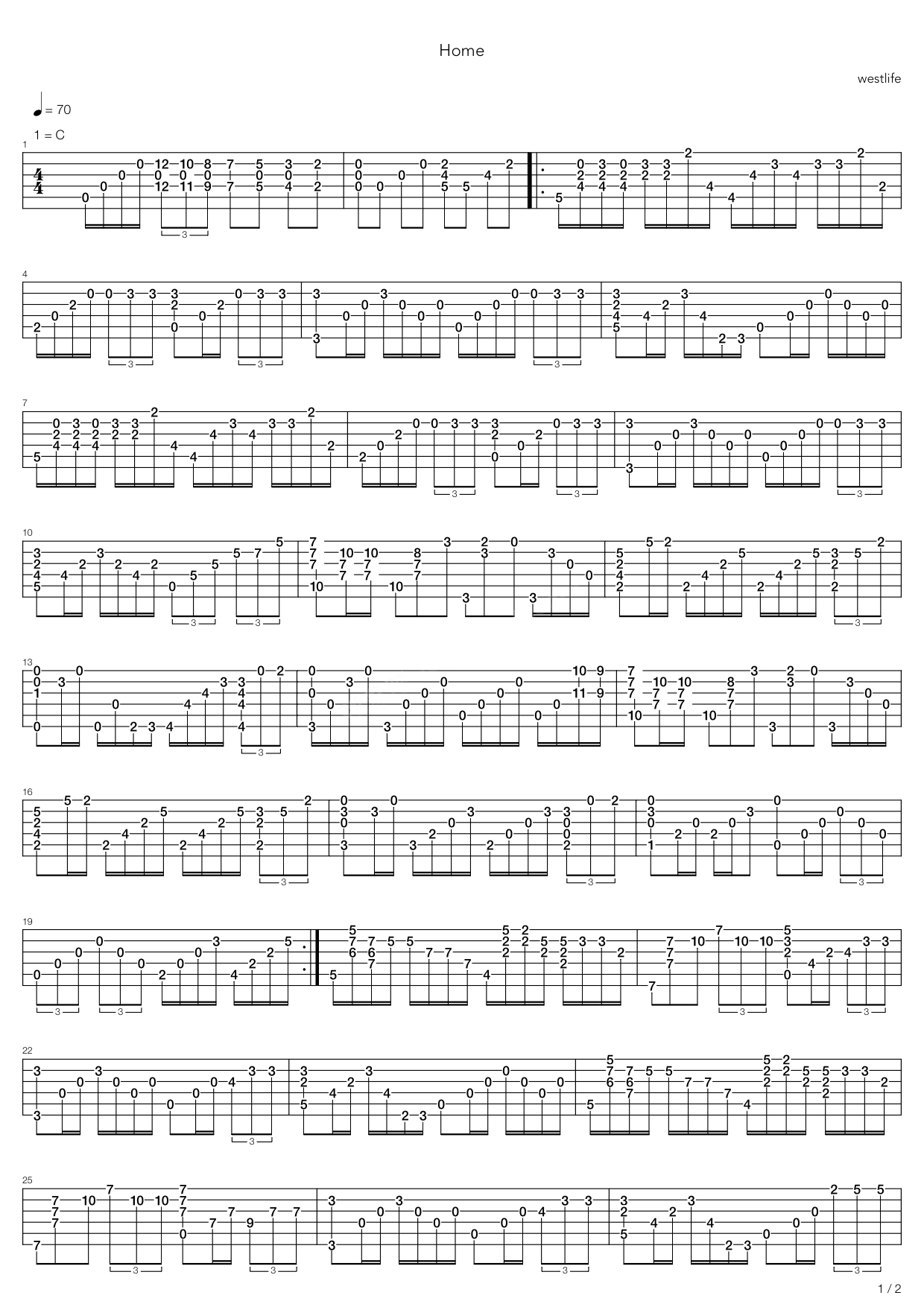 曲谱介绍: Westlife《Home》吉他独奏谱,采用C调指法编配,共有2张高清图谱,免翻页排版设计。