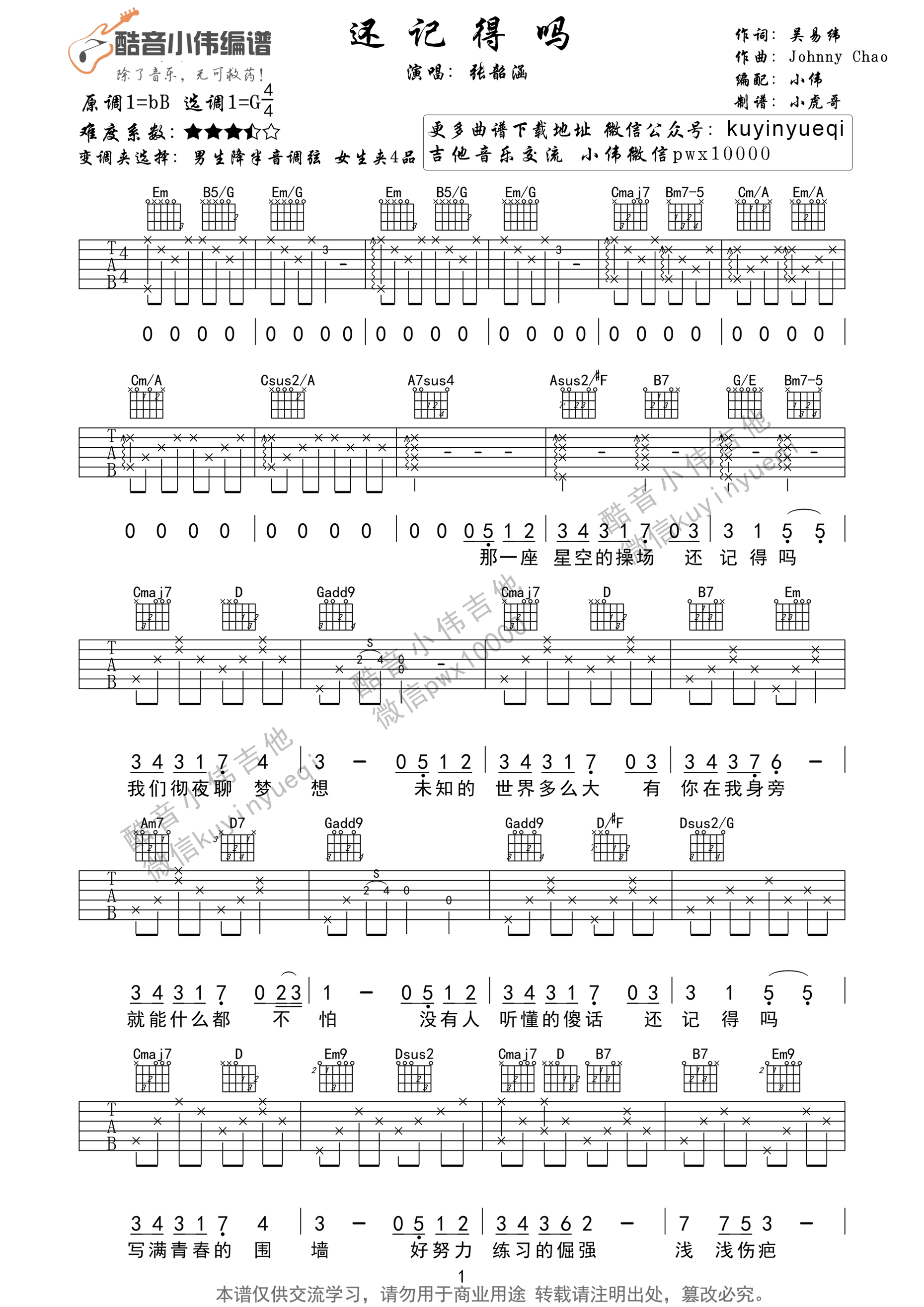 曲谱介绍: 张韶涵《还记得吗》吉他弹唱谱,采用G调指法编配,配音小伟吉他编配出品,共有3张高清图谱。