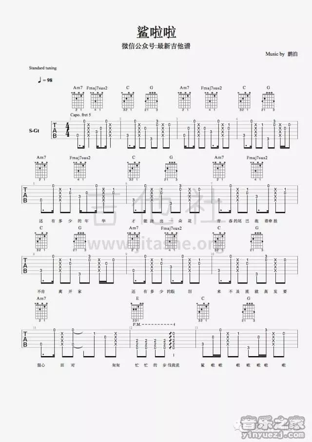 曲谱介绍: 鹏泊《鲨啦啦》吉他弹唱谱,采用A调指法编配,音乐之家编配出品,共有4张高清图谱。