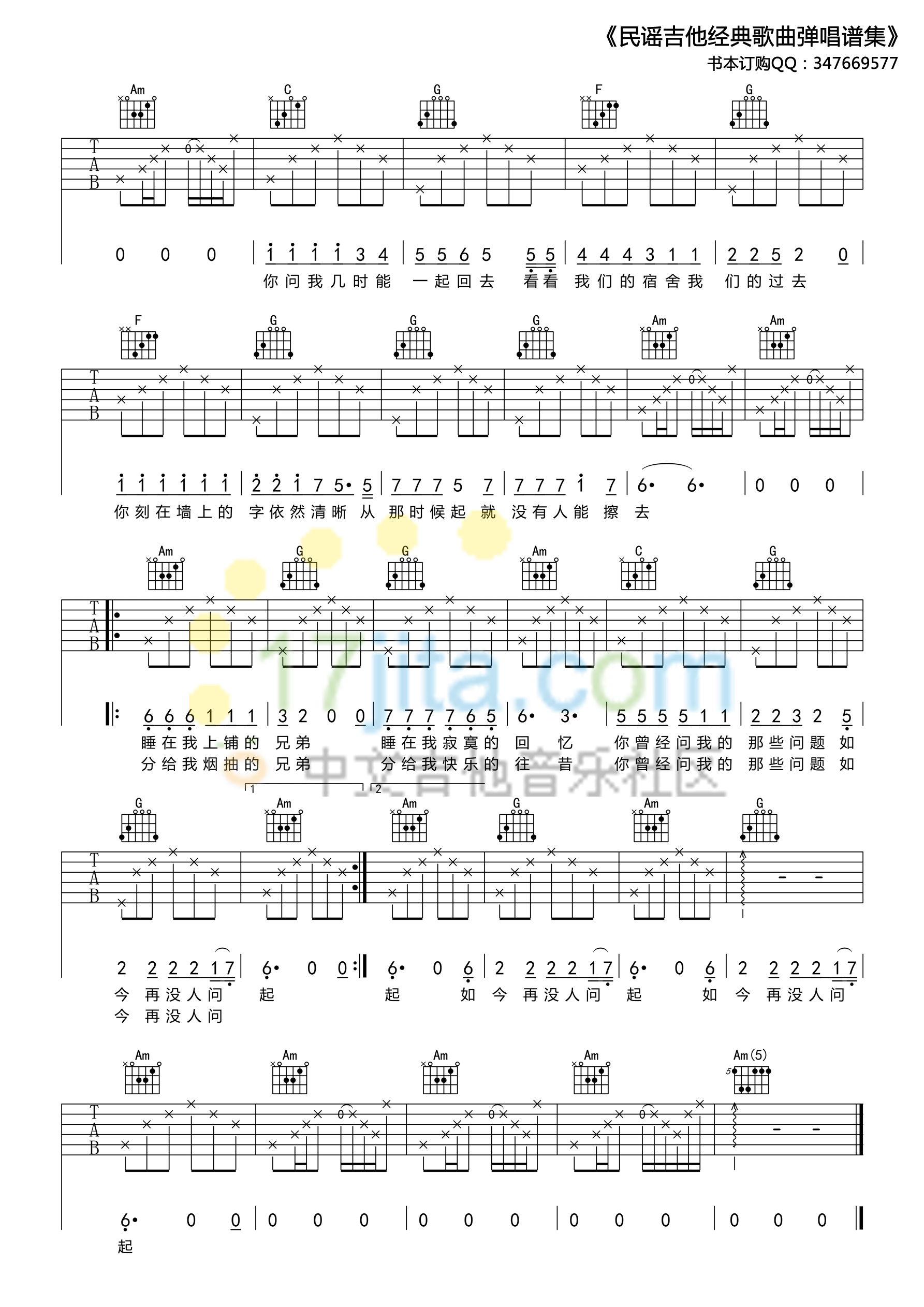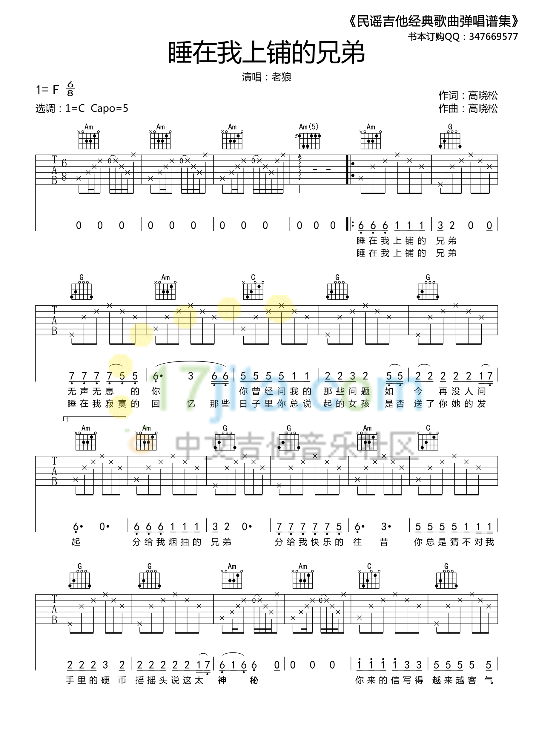曲谱介绍: 老狼《睡在我上铺的兄弟》吉他弹唱谱,采用C调指法编配,高晓松编配出品,共有3张高清图谱。