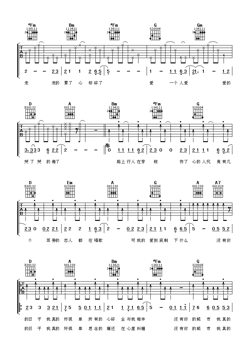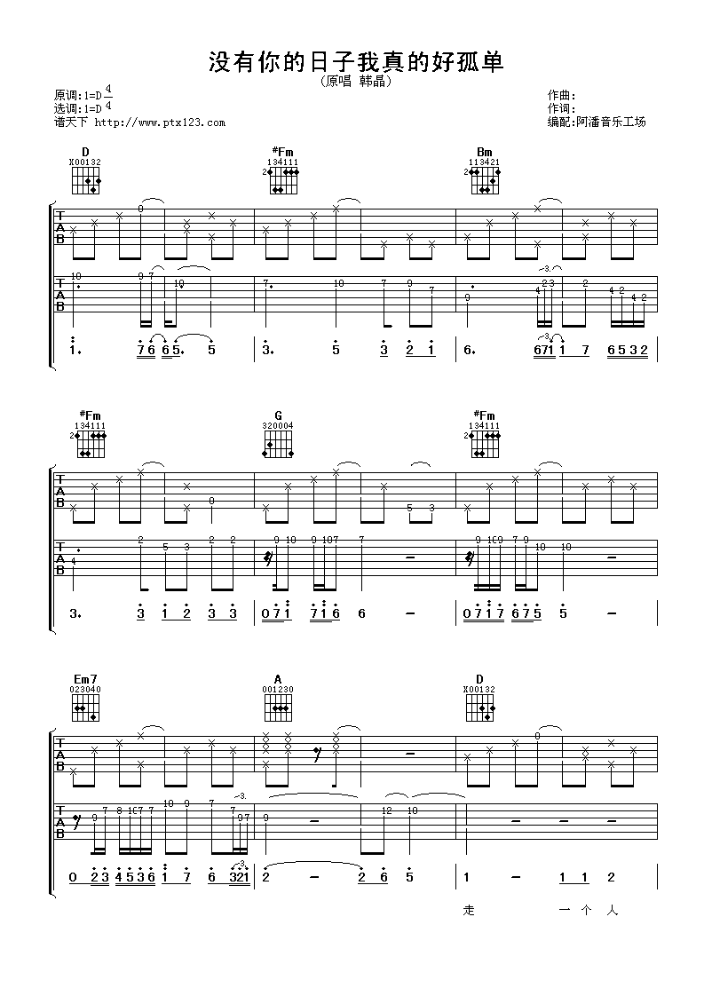 曲谱介绍: 韩晶《没有你的日子我真的好孤单》吉他弹唱谱,采用D调指法编配,阿潘音乐工场编配出品,共有4张高清图谱。