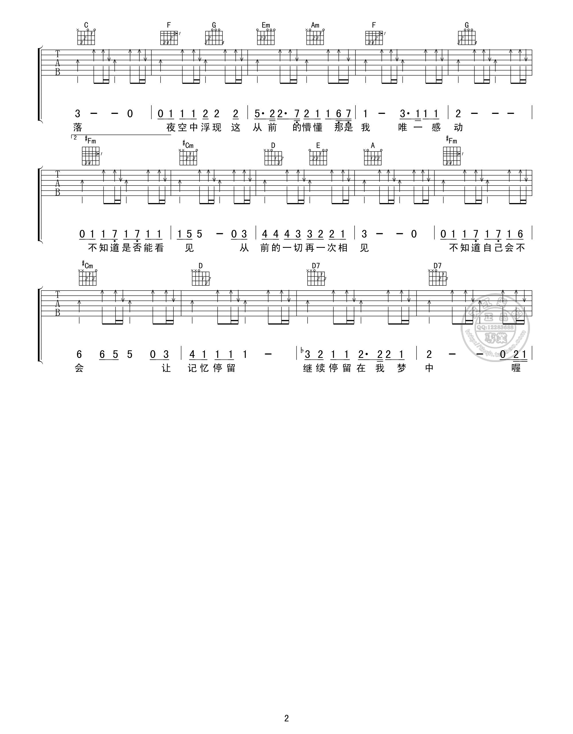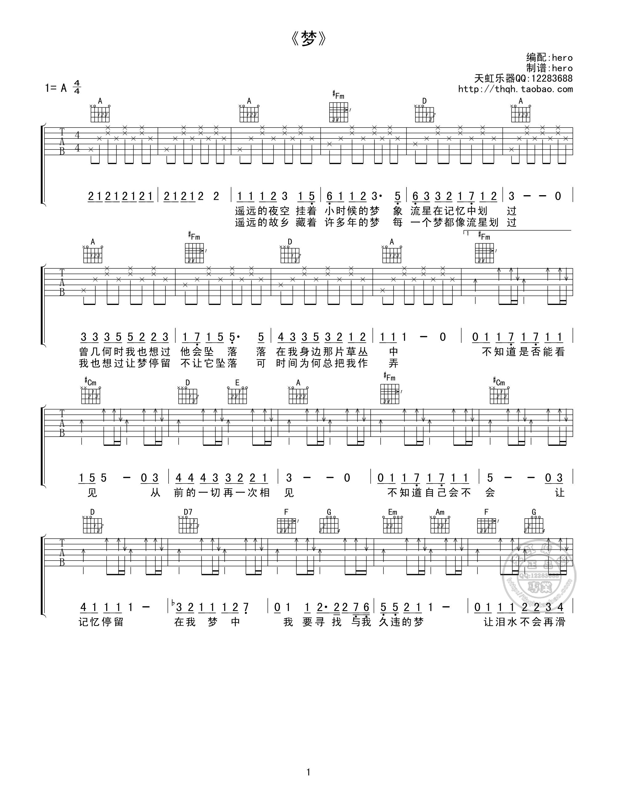 曲谱介绍: 绿色频道乐队《梦》吉他弹唱谱,采用A调指法编配,天虹乐器编配出品,共有2张高清图谱,免翻页排版设计。