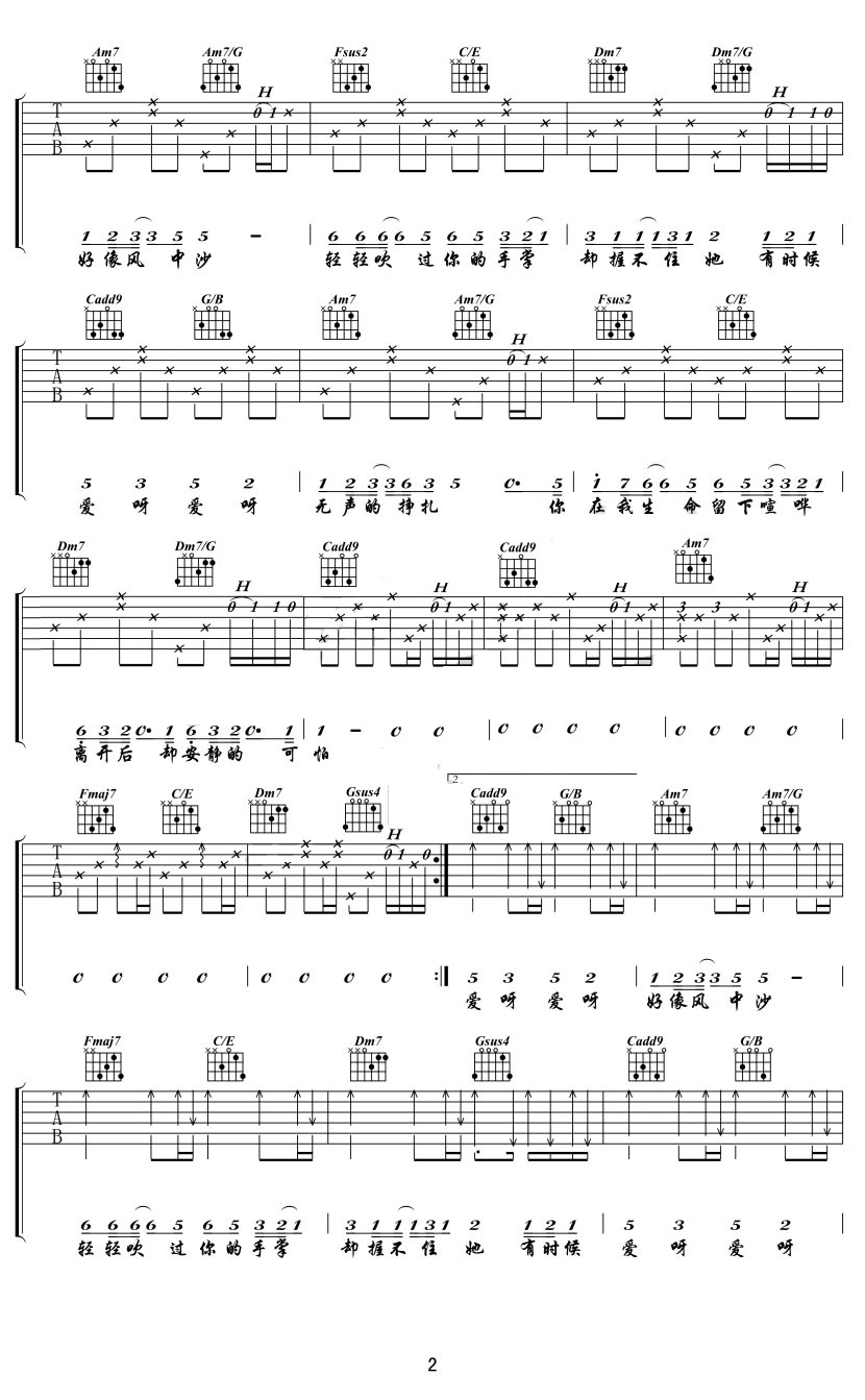 曲谱介绍: 金玟岐《爱呀》吉他弹唱谱,采用C调指法编配,音乐之家编配出品,共有4张高清图谱。