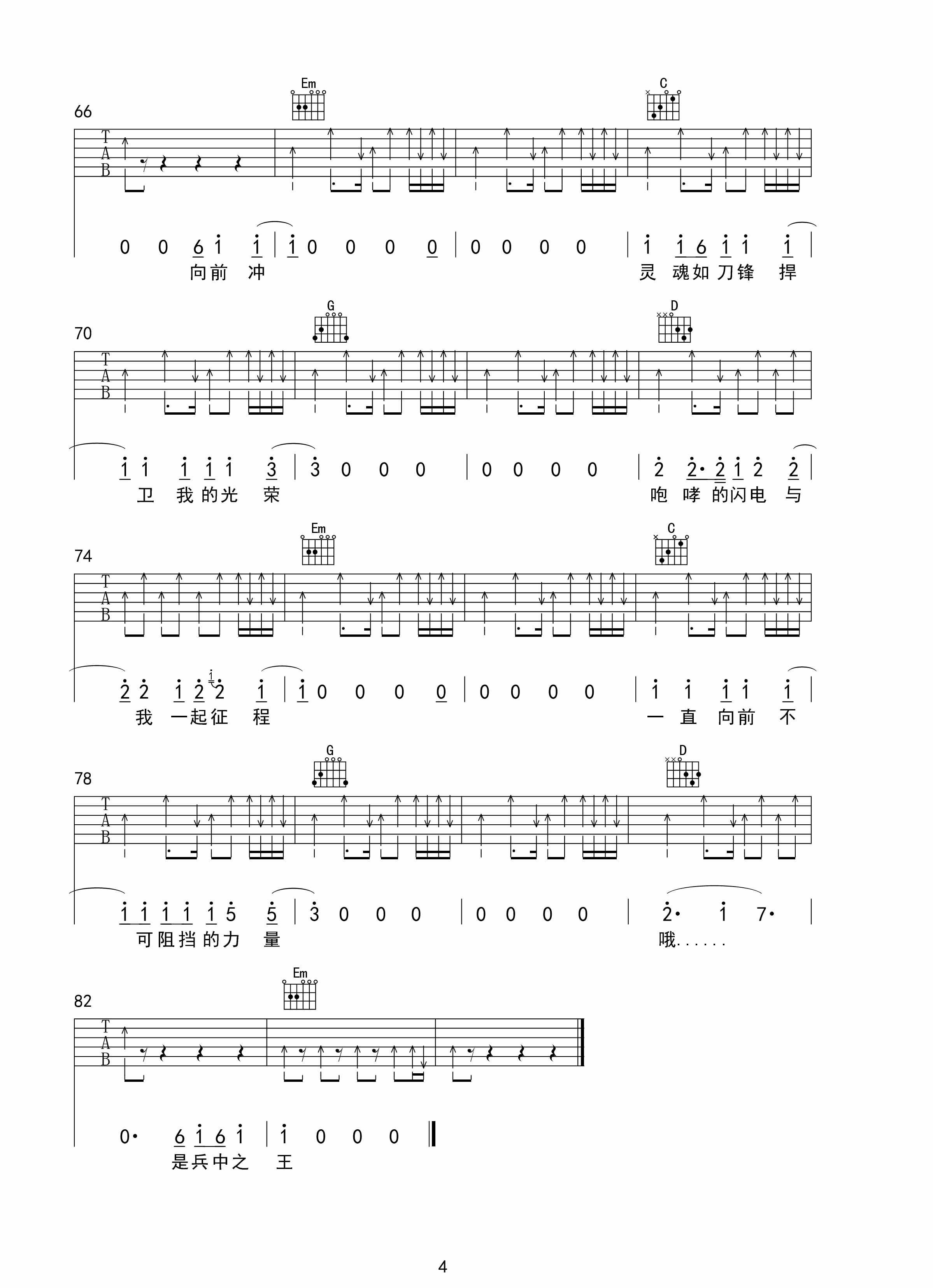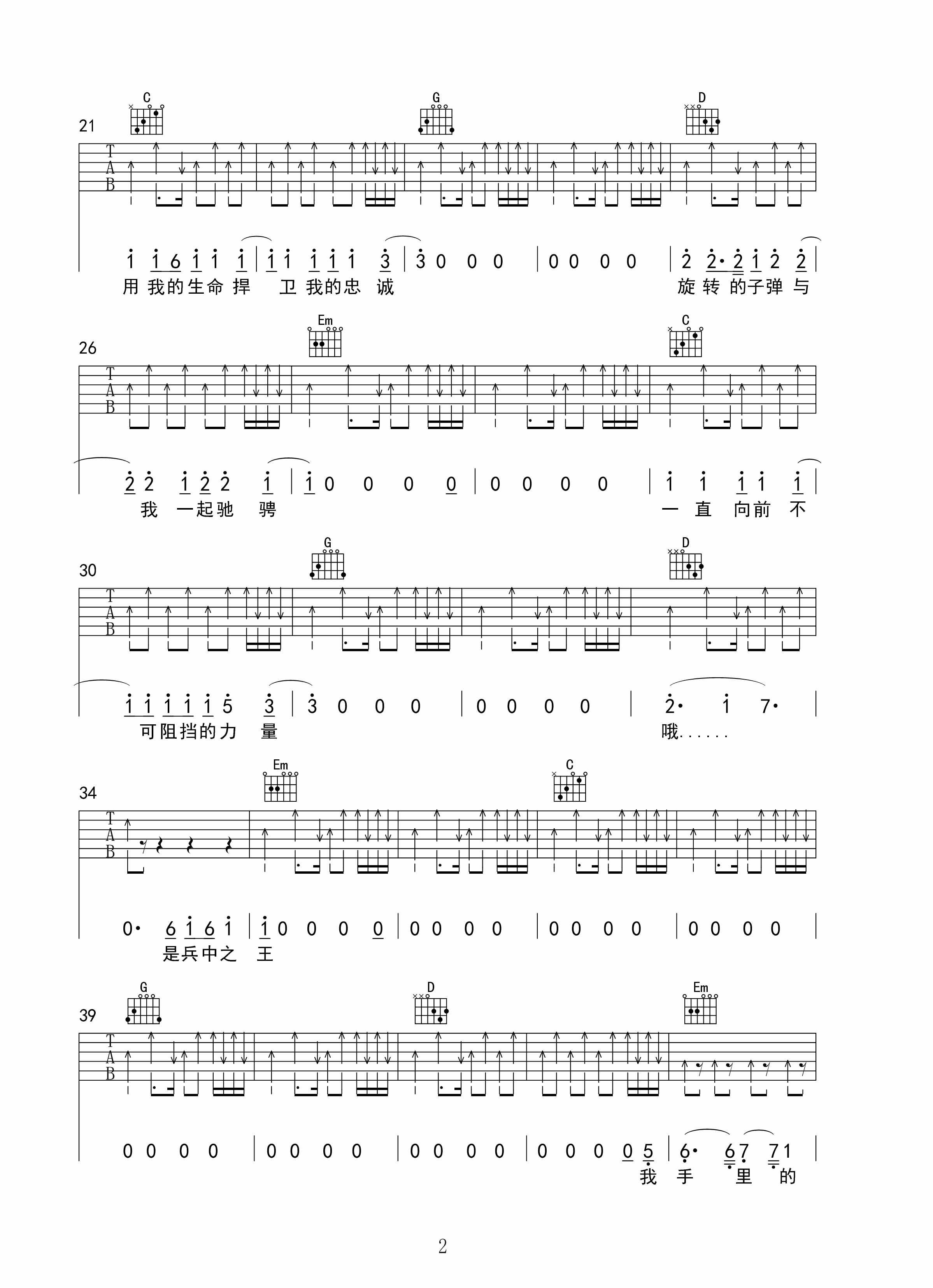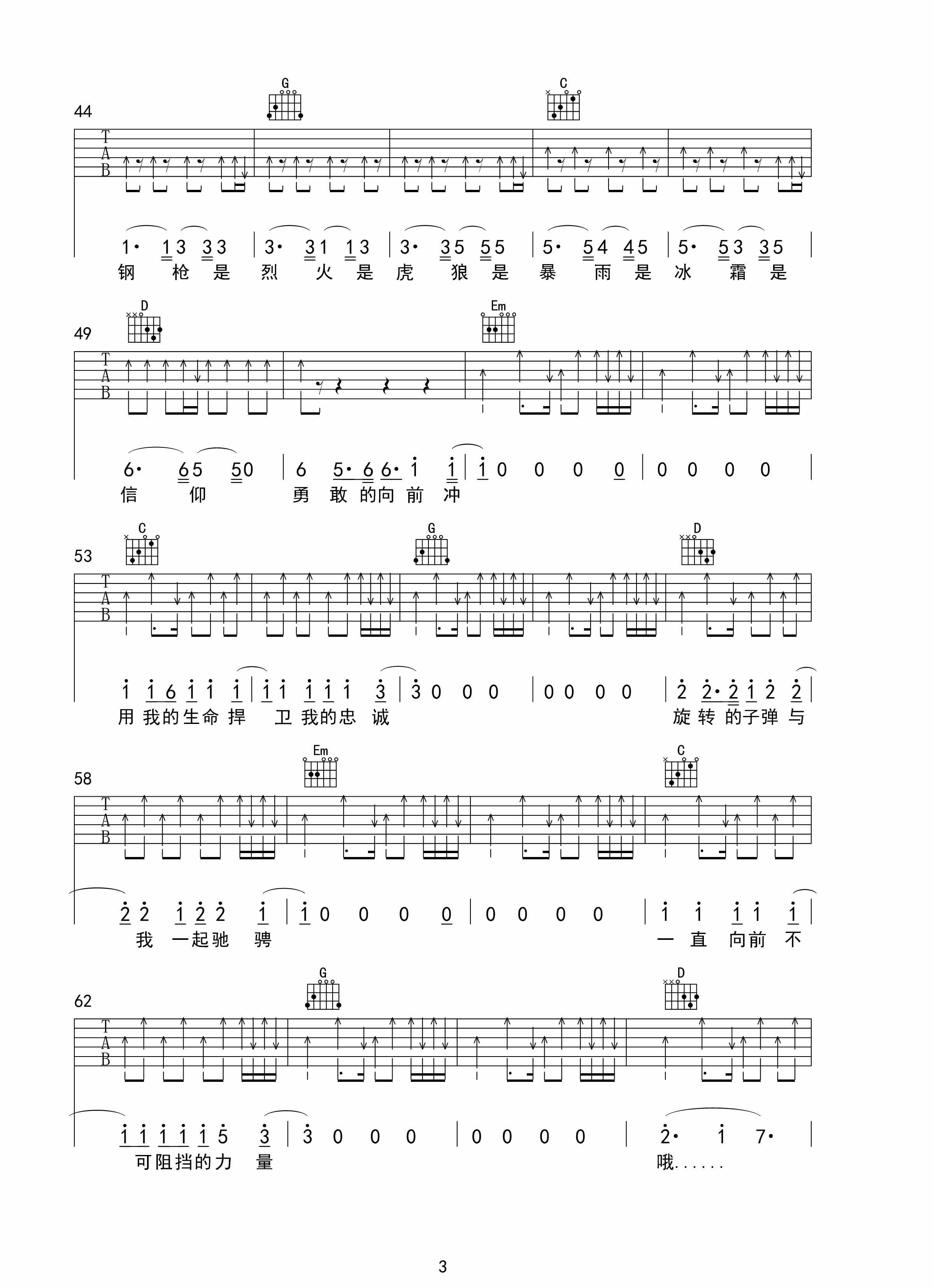 曲谱介绍: 中华《热血兵王》吉他弹唱谱,采用F调指法编配,共有4张高清图谱。