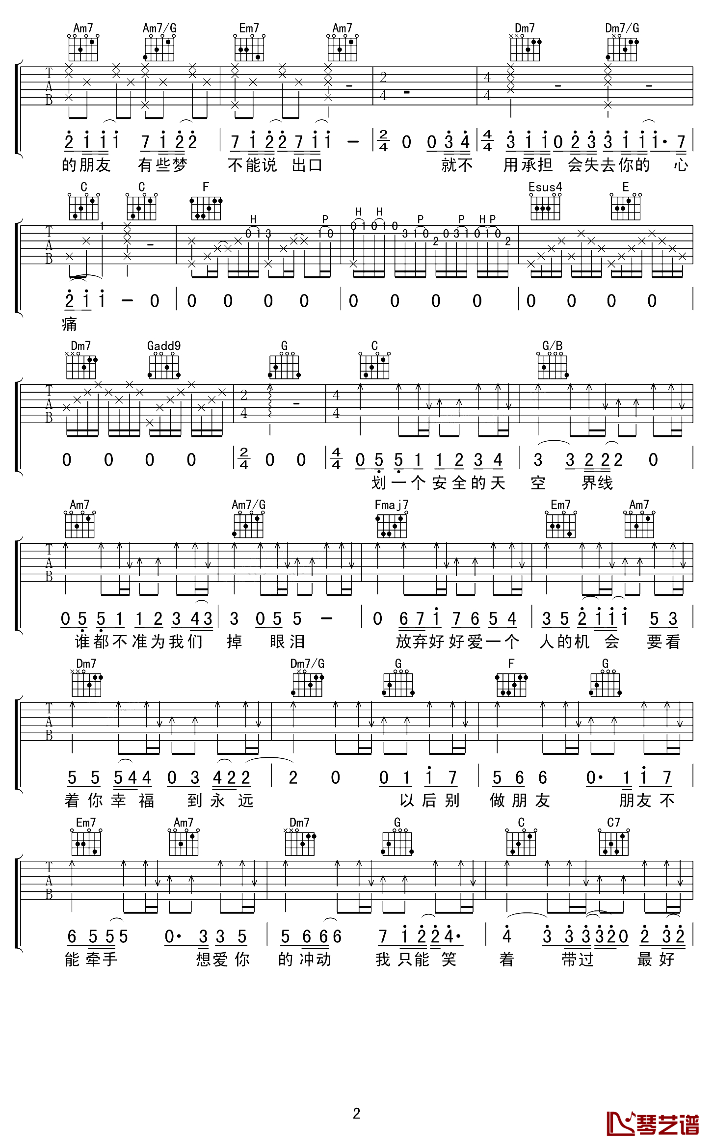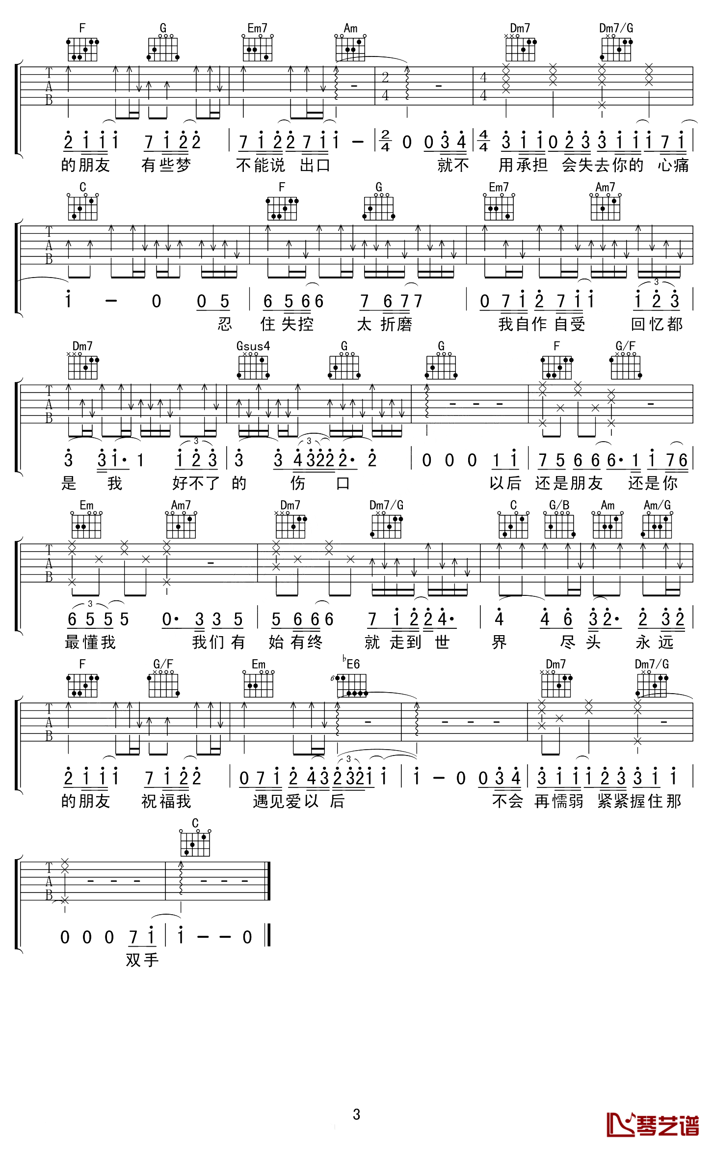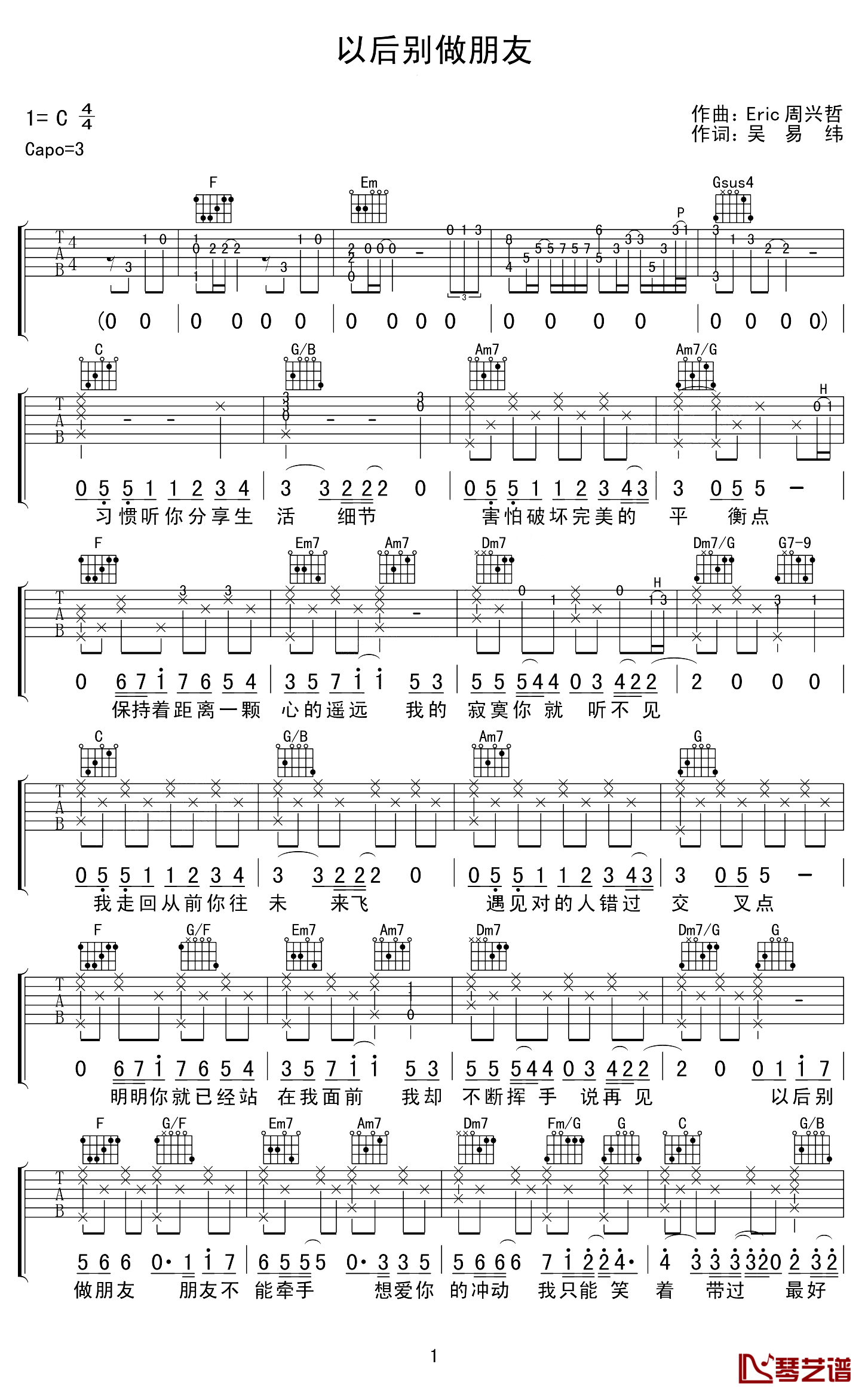 曲谱介绍: 周兴哲《以后别做朋友》吉他弹唱谱,采用C调指法编配,琴艺谱编配出品,共有3张高清图谱。