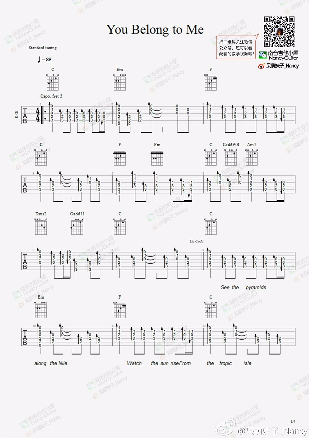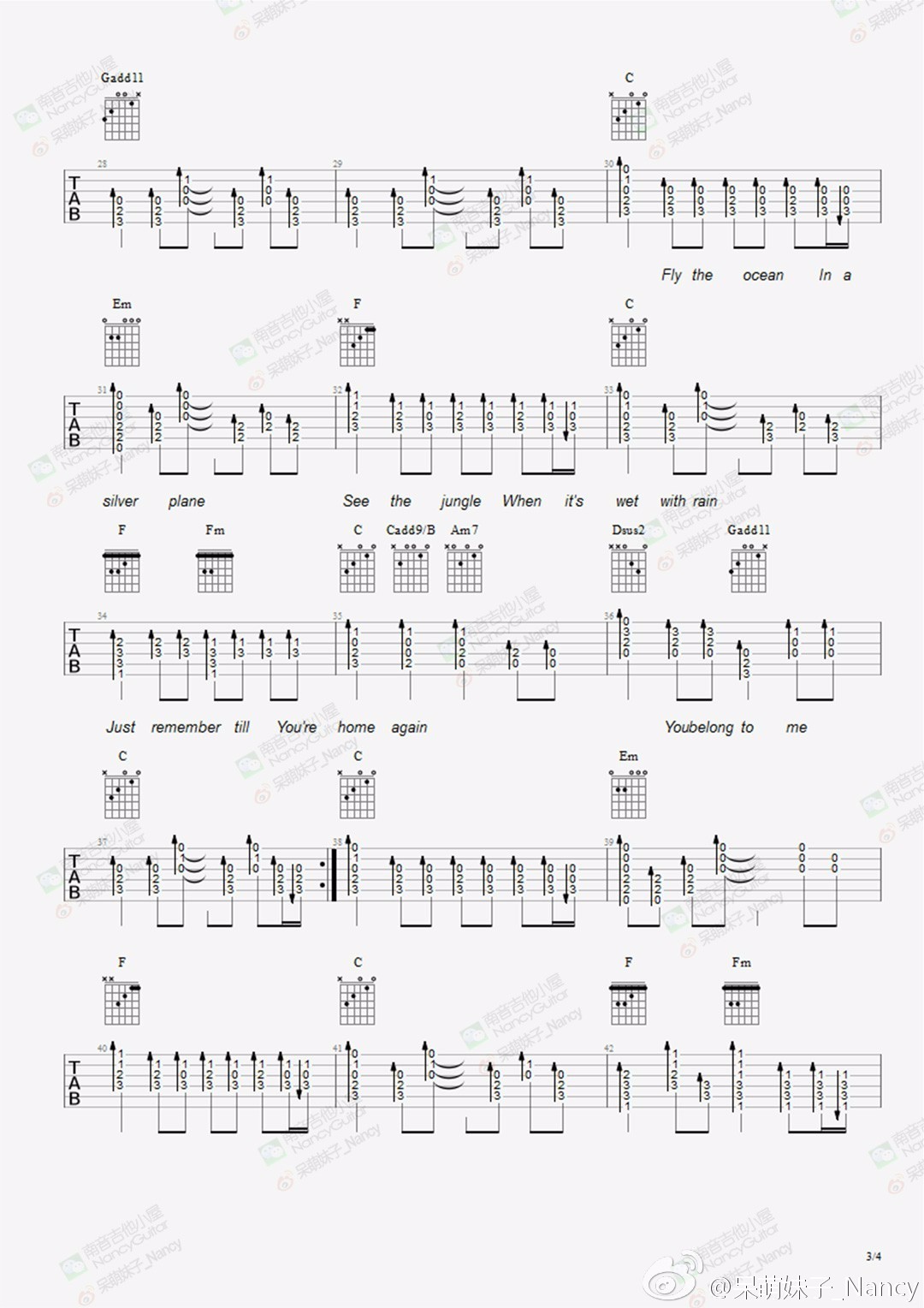 曲谱介绍: you《youbelongtome》吉他弹唱谱,采用C调指法编配,南音吉他小屋编配出品,共有4张高清图谱。