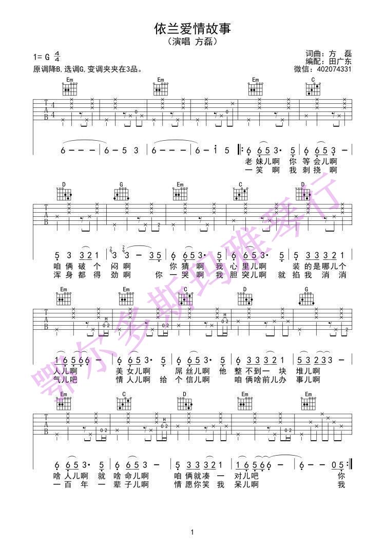 曲谱介绍: 方磊《依兰爱情故事》吉他弹唱谱,采用G调指法编配,鄂尔多斯玛雅琴行编配出品,共有3张高清图谱。