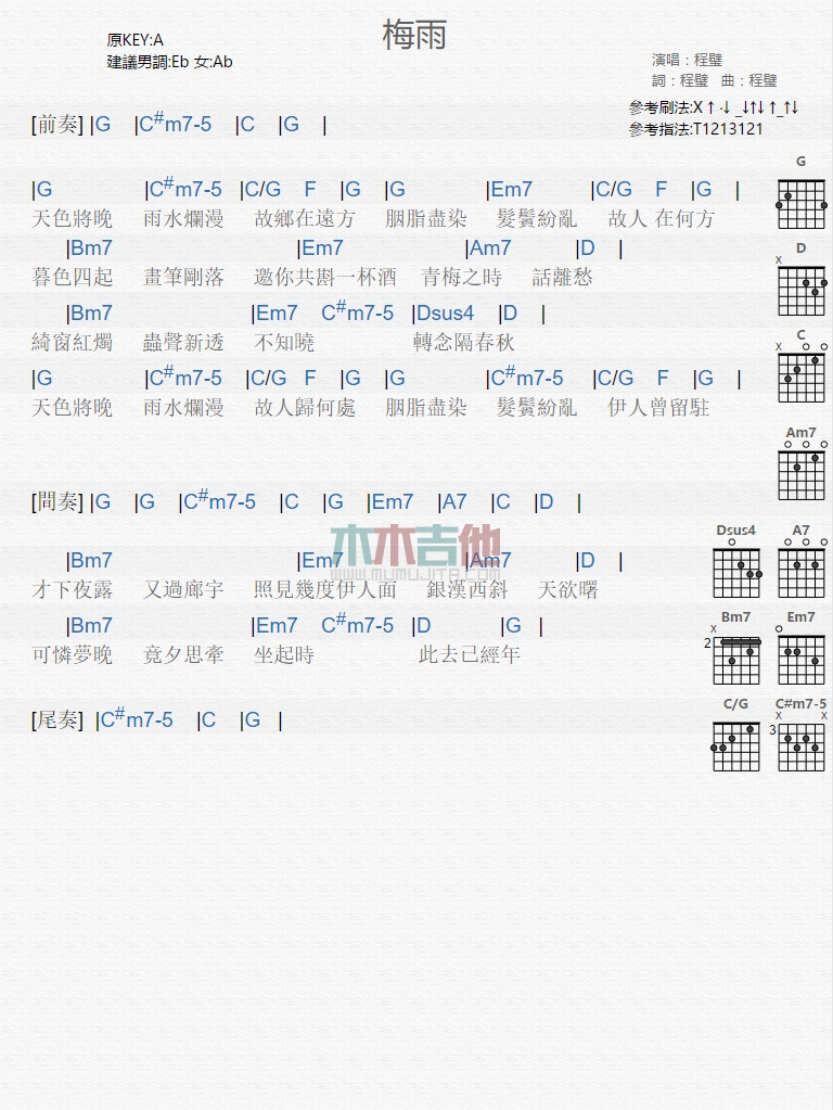 曲谱介绍: 程璧《梅雨》吉他弹唱谱,采用A调指法编配,木木吉他编配出品,共有1张高清图谱,免翻页排版设计。