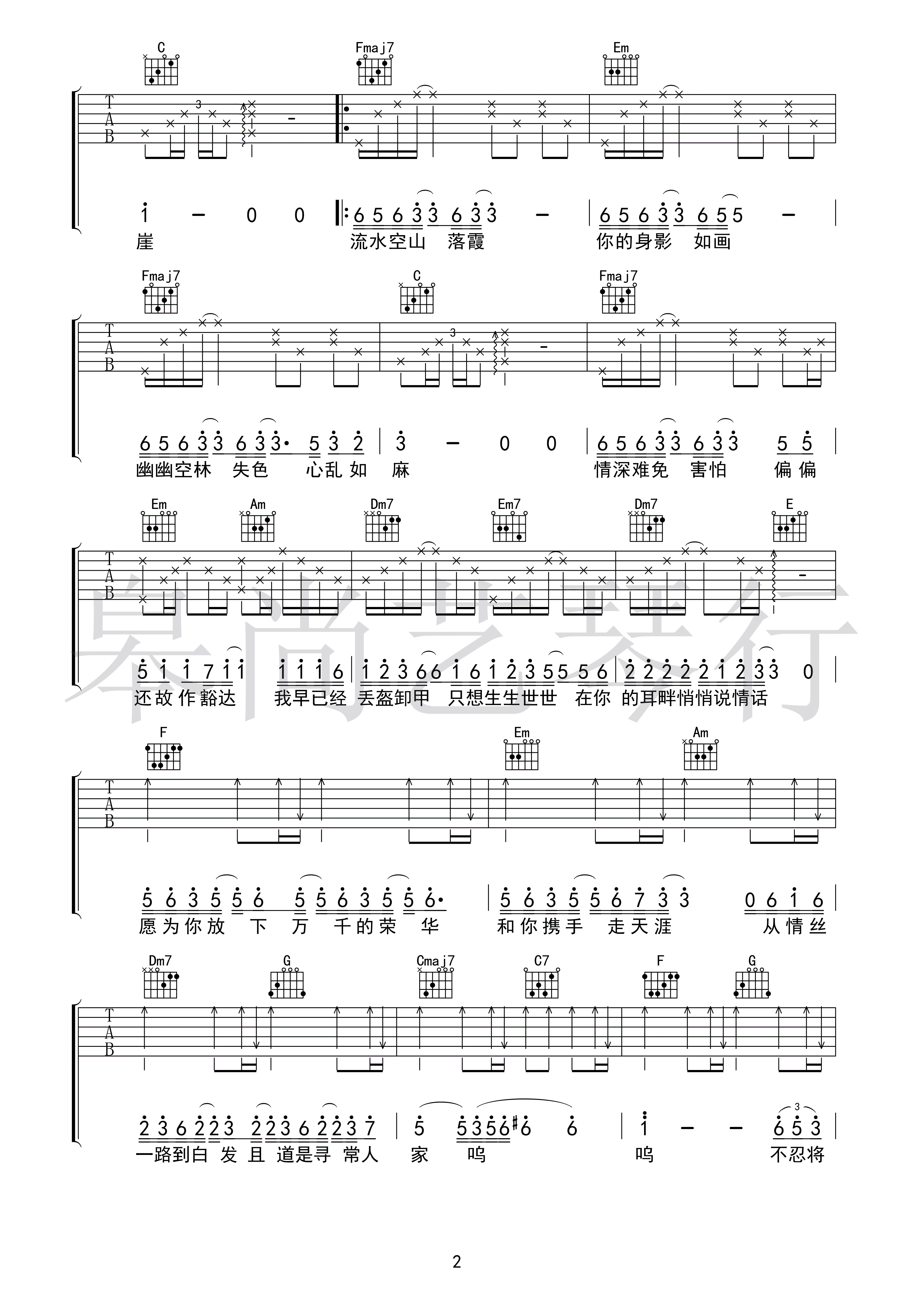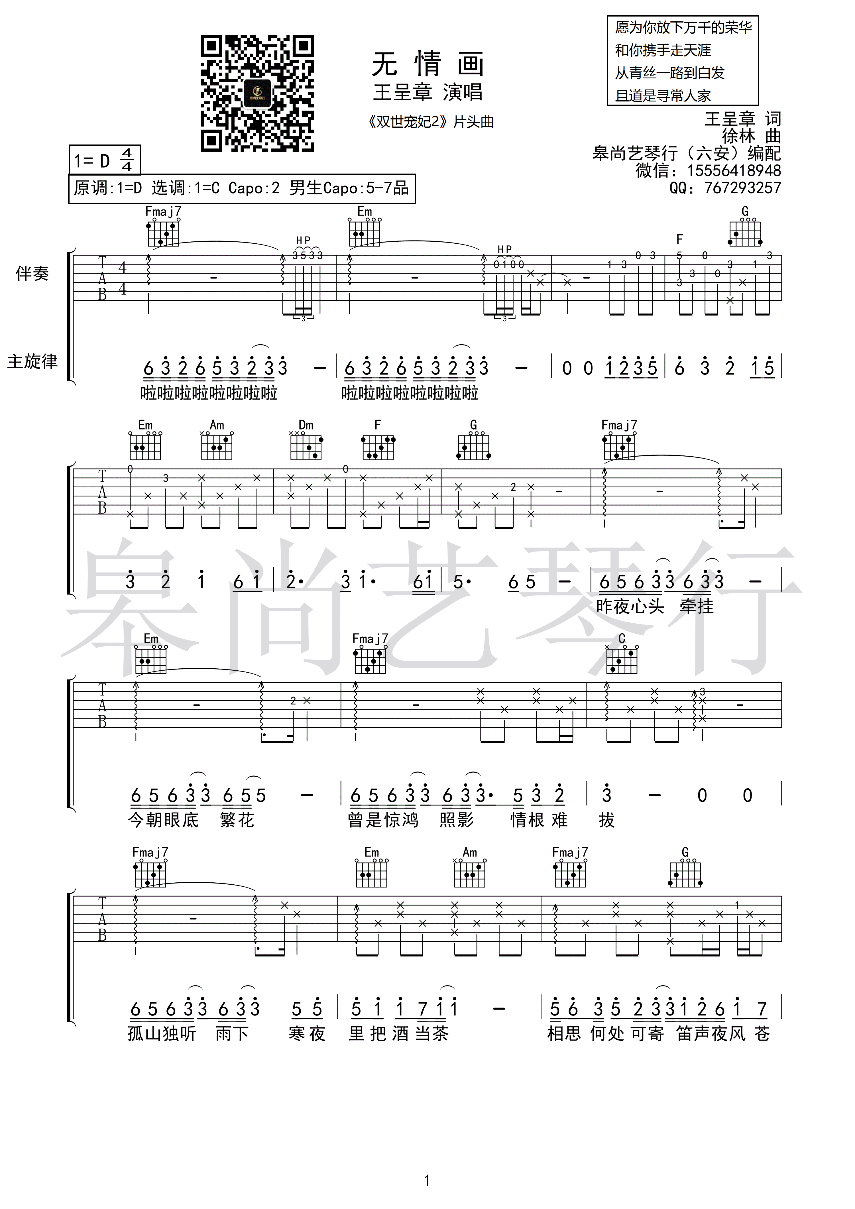 曲谱介绍: 王呈章《无情画》吉他弹唱谱,采用C调指法编配,皋尚艺琴行编配出品,共有3张高清图谱。