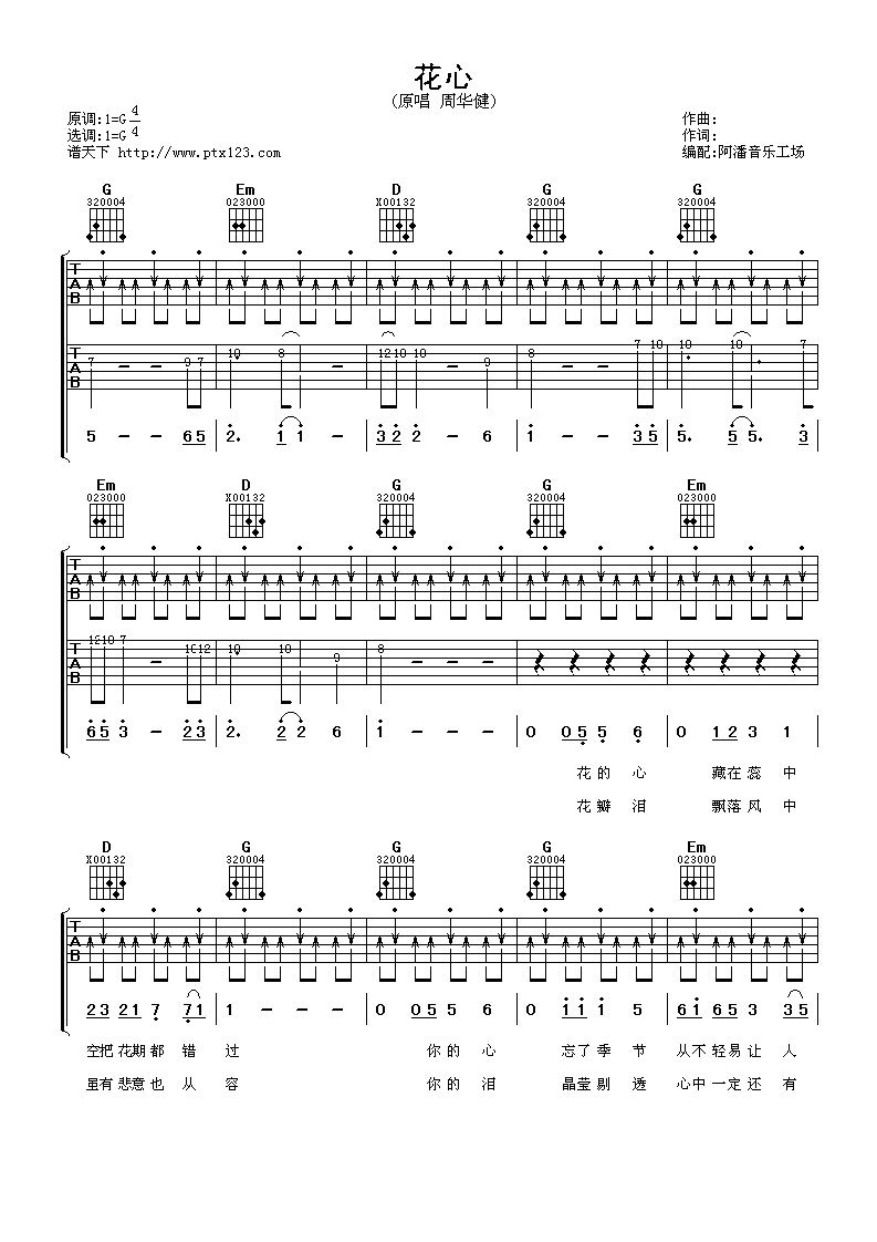 曲谱介绍: 周华健《花心》吉他弹唱谱,采用G调指法编配,阿潘音乐工场编配出品,共有3张高清图谱。