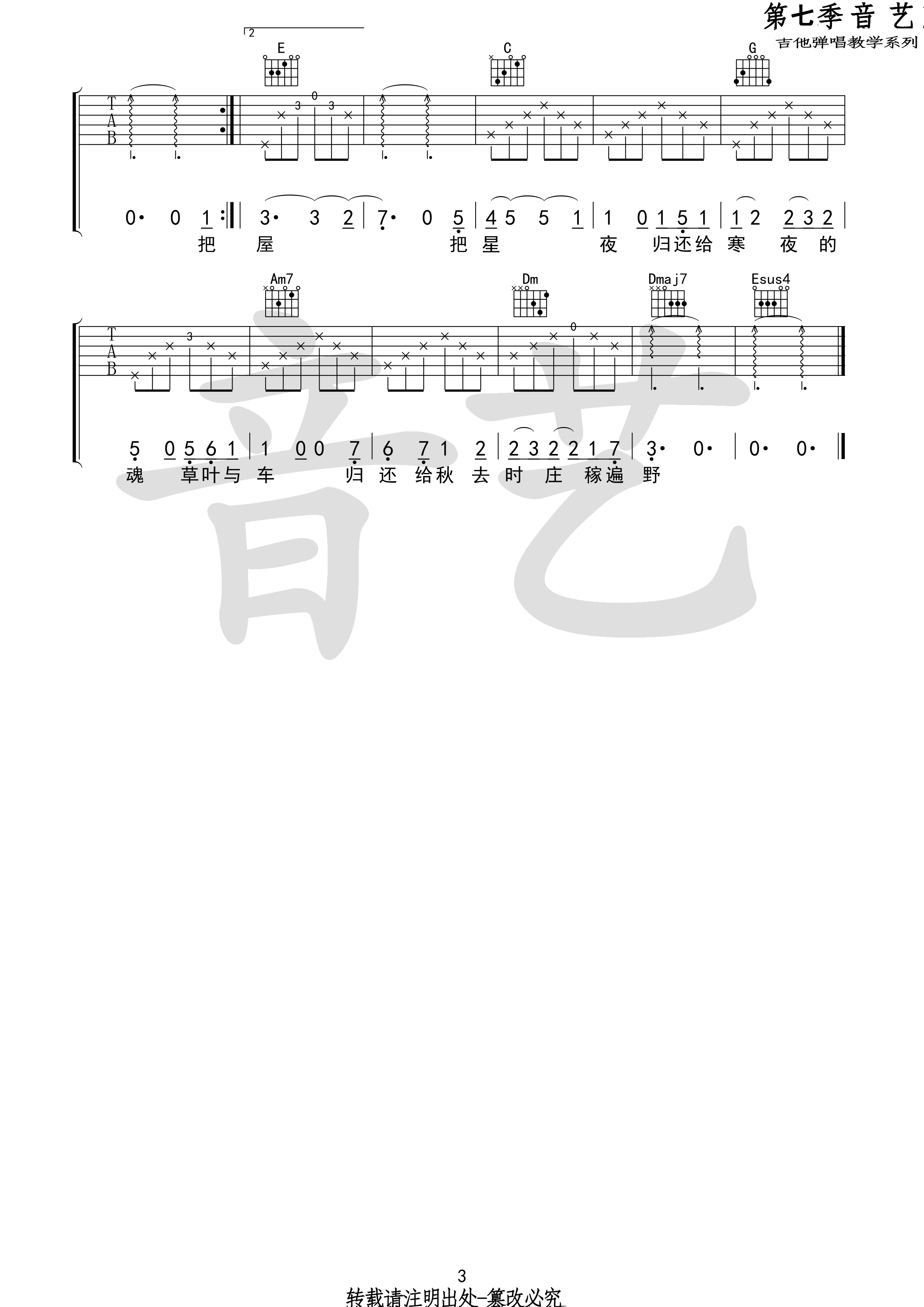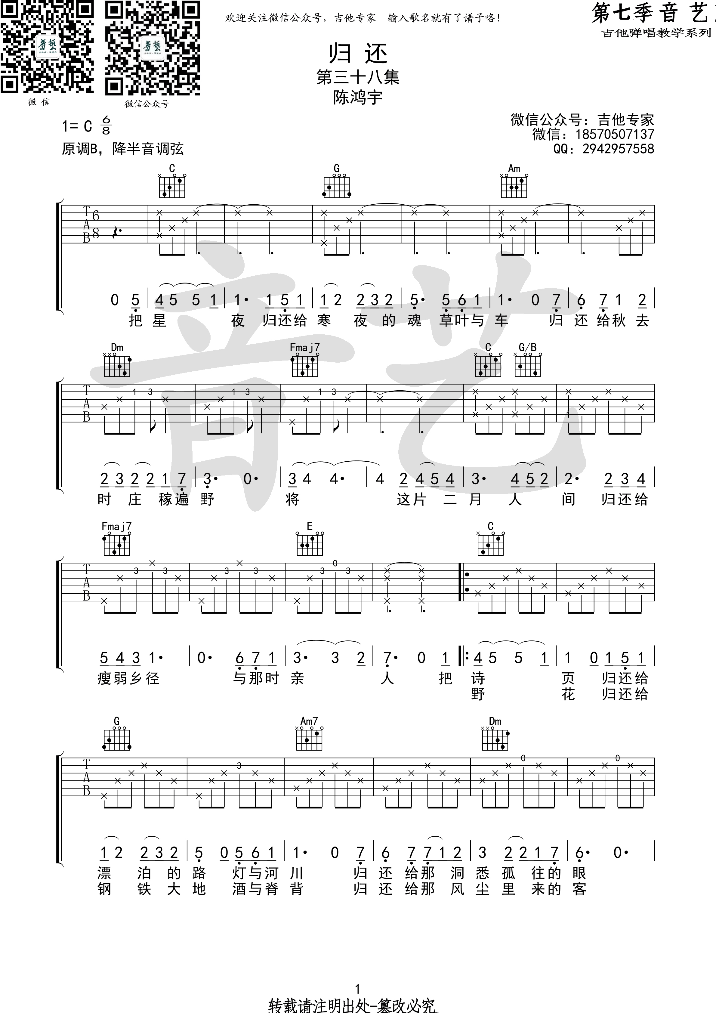 曲谱介绍: 陈鸿宇《归还》吉他弹唱谱,采用C调指法编配,音艺吉他编配出品,共有3张高清图谱。