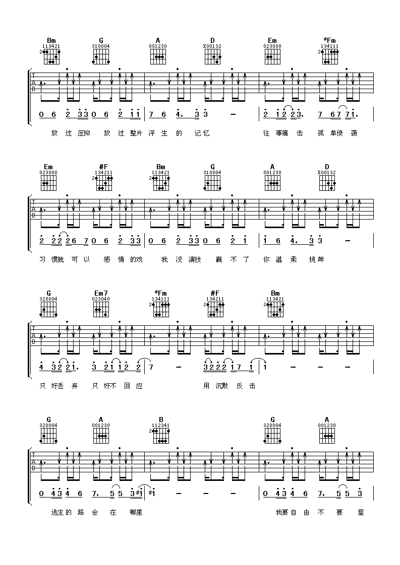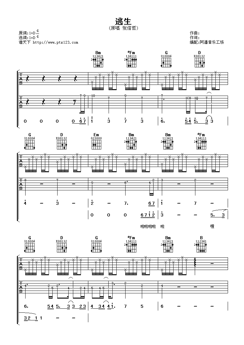 曲谱介绍: 张信哲《逃生》吉他弹唱谱,采用D调指法编配,阿潘音乐工场编配出品,共有4张高清图谱。